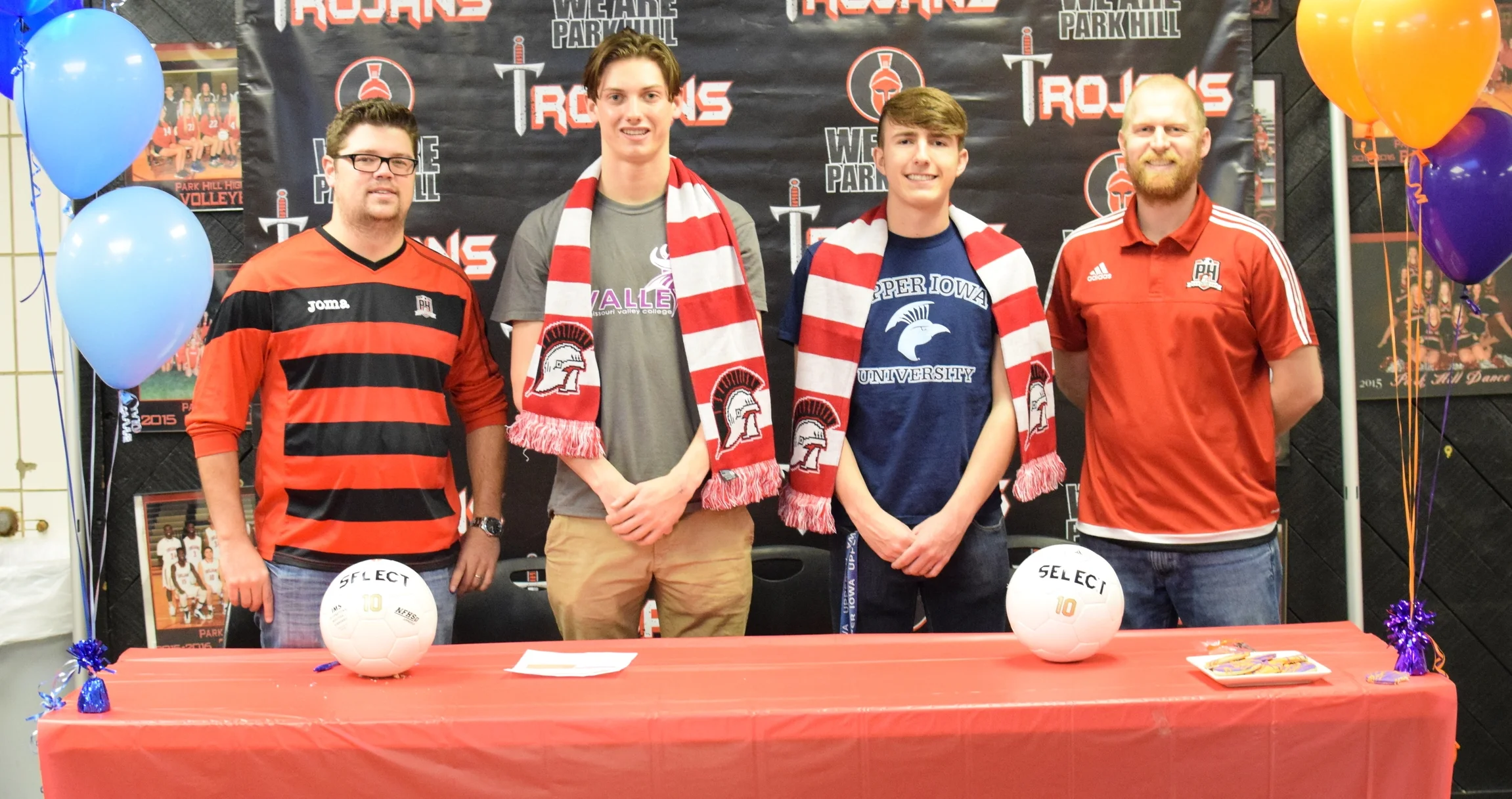 Park Hill seniors Peyton LaFerla, left center, and Christian Fullmer, right center, recently signed to play collegiate soccer in a ceremony held Friday, Feb. 26 at Park Hill High School in Kansas City, Mo. LaFerla signed at Missouri Valley, an NAIA school, while Fullmer inked his commitment to Upper Iowa, an NCAA Division II program