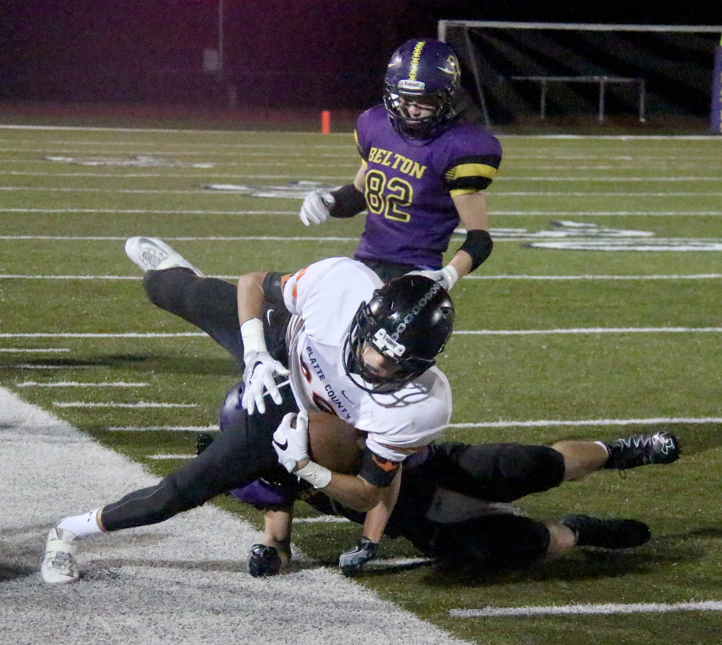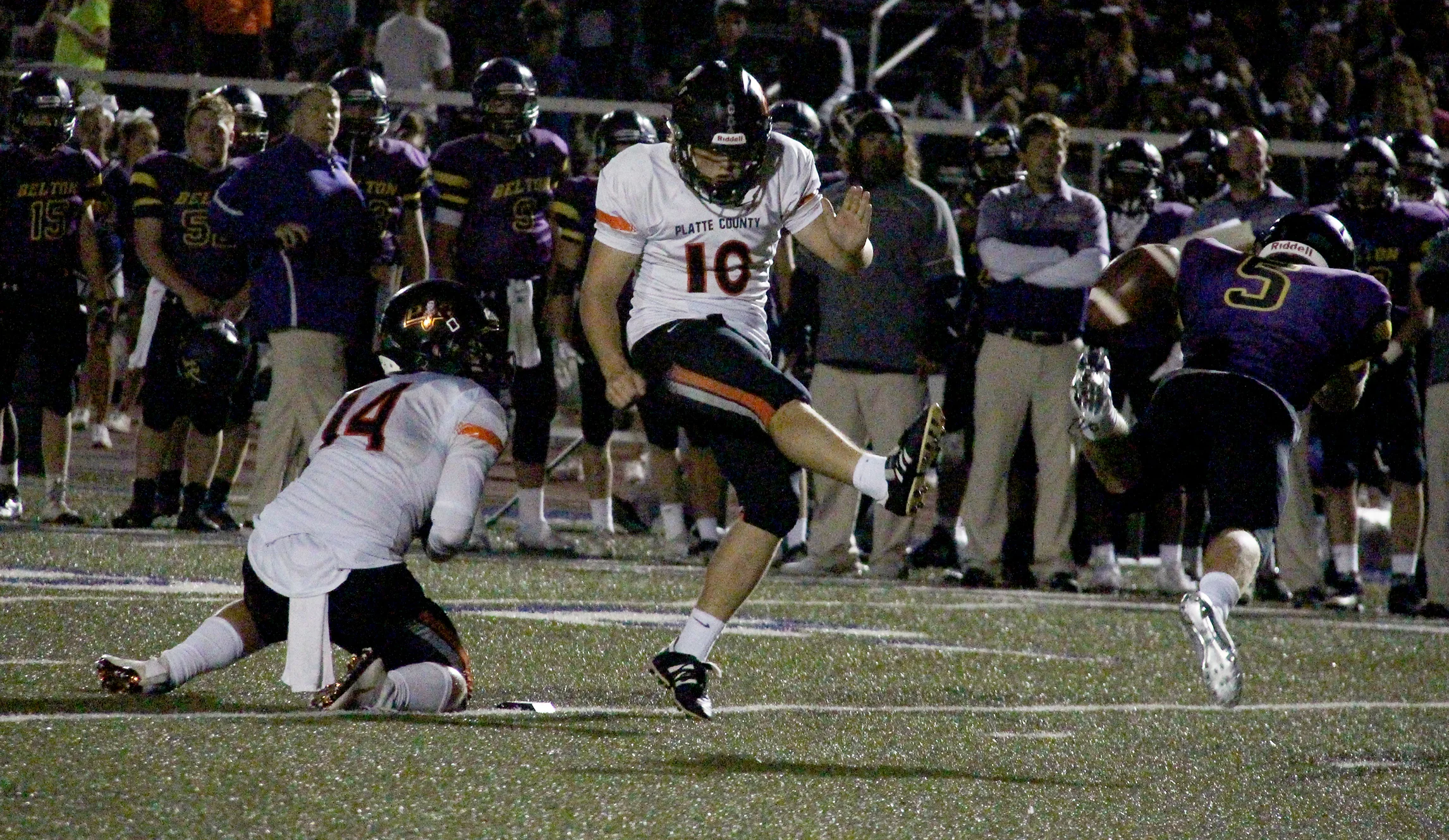 The tide swung during a key stretch of the first half when Belton turned an interception of Platte County quarterback Justin Mitchell into a touchdown then added another seven points on the biggest play of the game. Down 14-10 late in the second quarter, Platte County lined up for a 35-yard field goal attempt from junior kicker Parker Lacina, who had booted a 22-yarder 7 minutes earlier to give Platte County its only brief lead.