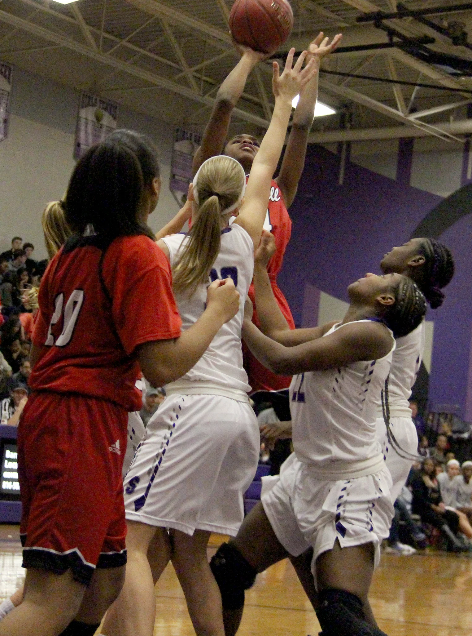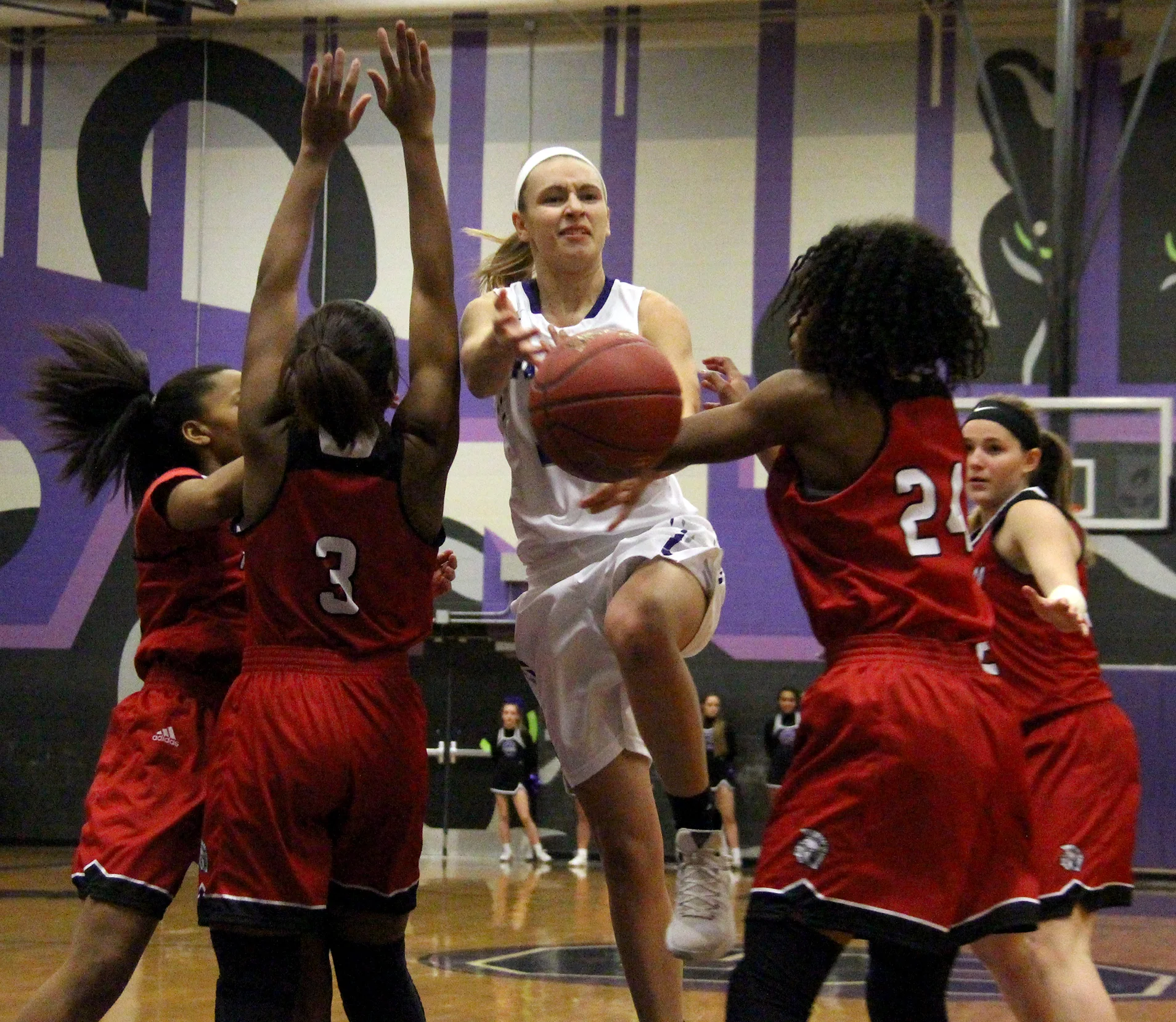 Park Hill guard Taiya Shelby (rear) goes up for a shot over three Park Hill South defenders in a game Wednesday, Dec. 21 at Park Hill South High School in Riverside, Mo.
