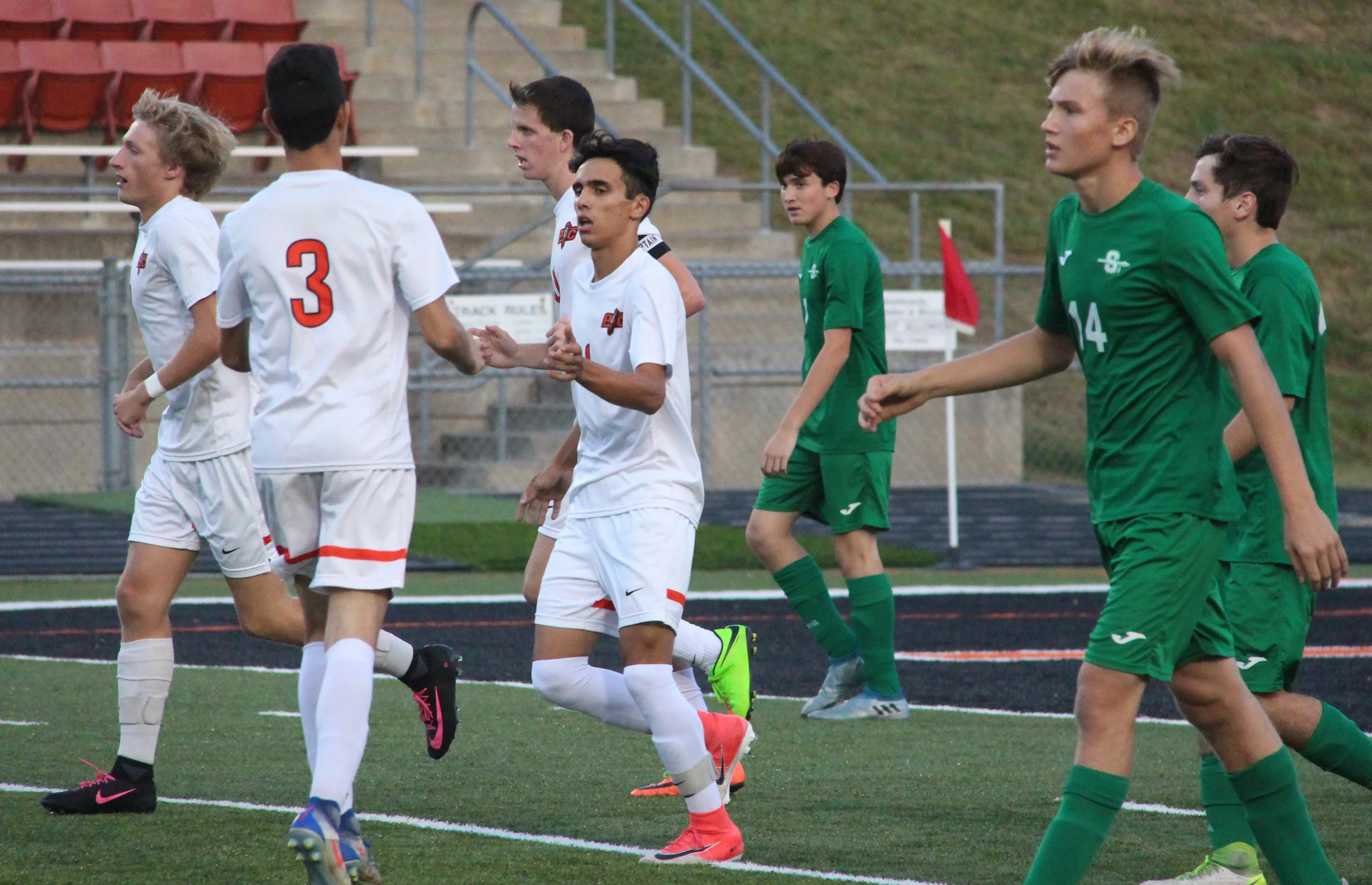 Platte County senior Chandler Peterson (center) celebrates his first half goal against Smithville.