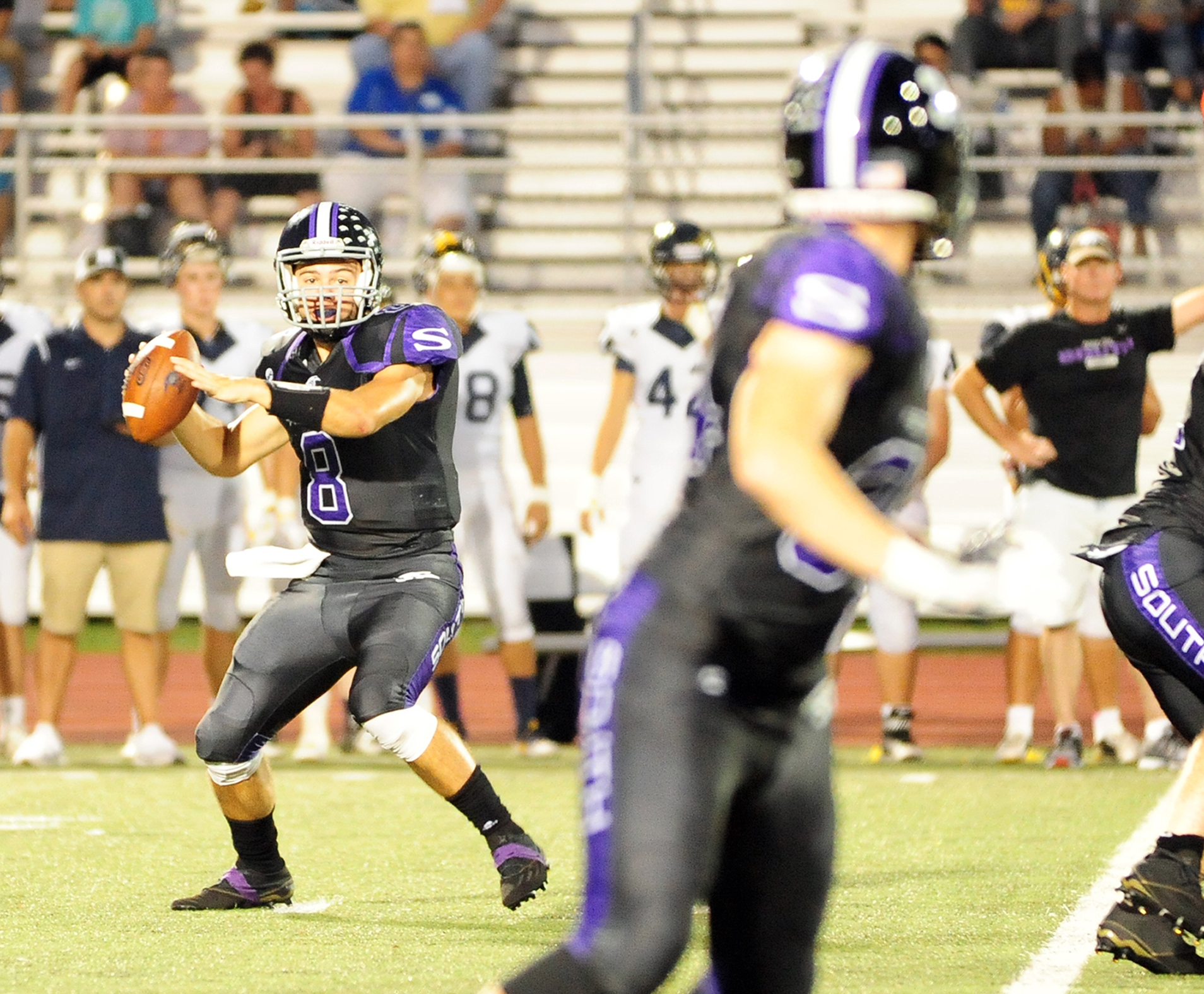 Park Hill South senior quarterback Zach Suchanick, left, prepares to throw a pass in the win against Liberty North on Friday, Sept. 23.