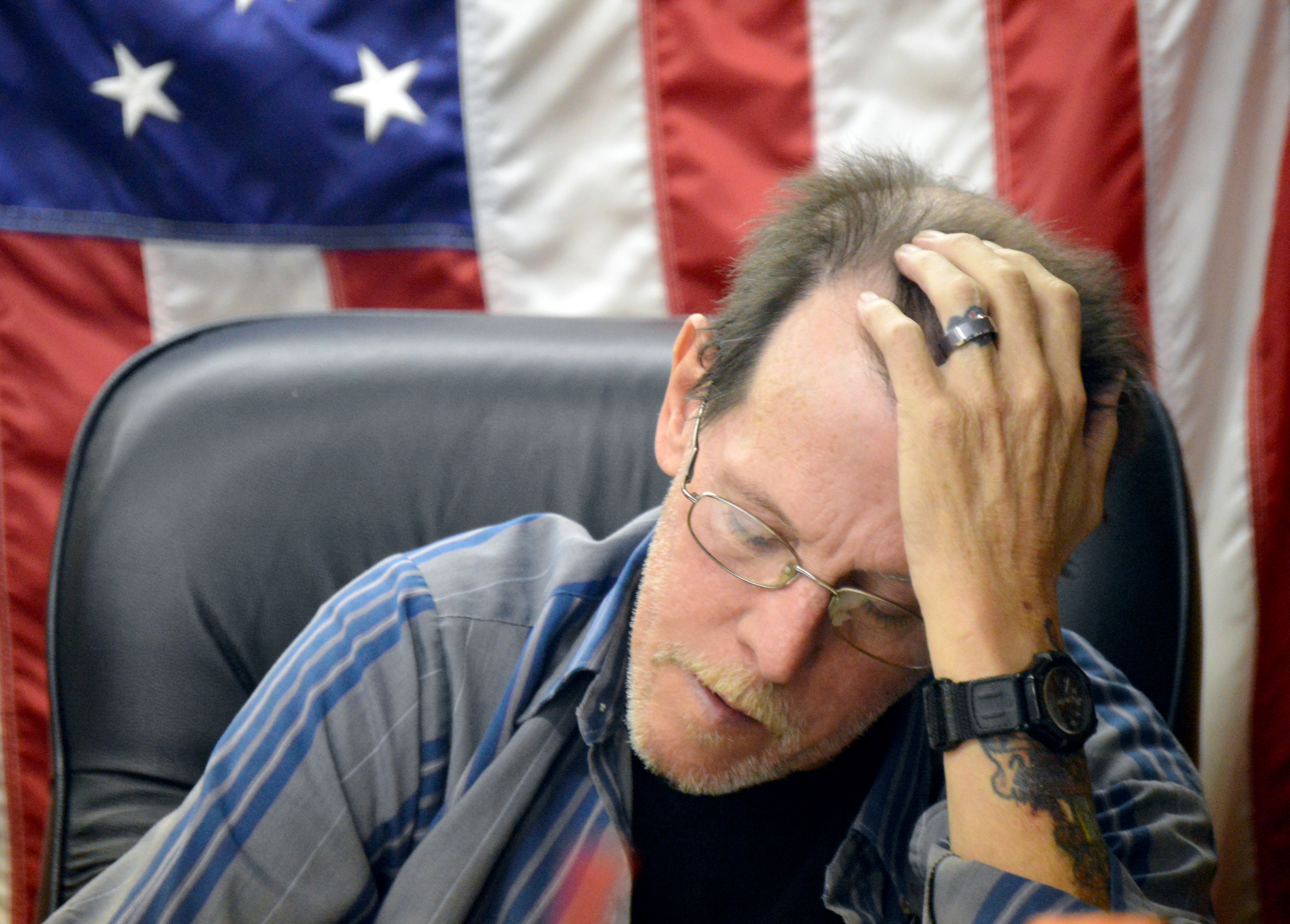 Ferrelview Board of Trustees chairperson Steve Carr puts his head in his hands while presiding over a contentious meeting Tuesday, June 14 at city hall in Ferrelview, Mo.