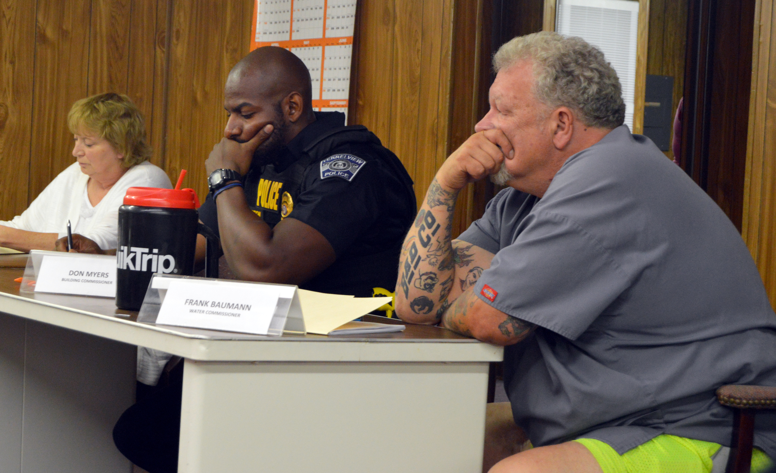 Ferrelview police chief Daniel Clayton, center, participated in discussion with the village’s board of trustees after the monthly meeting came back into open session Tuesday, June 14 at city hall in Ferrelview, Mo.