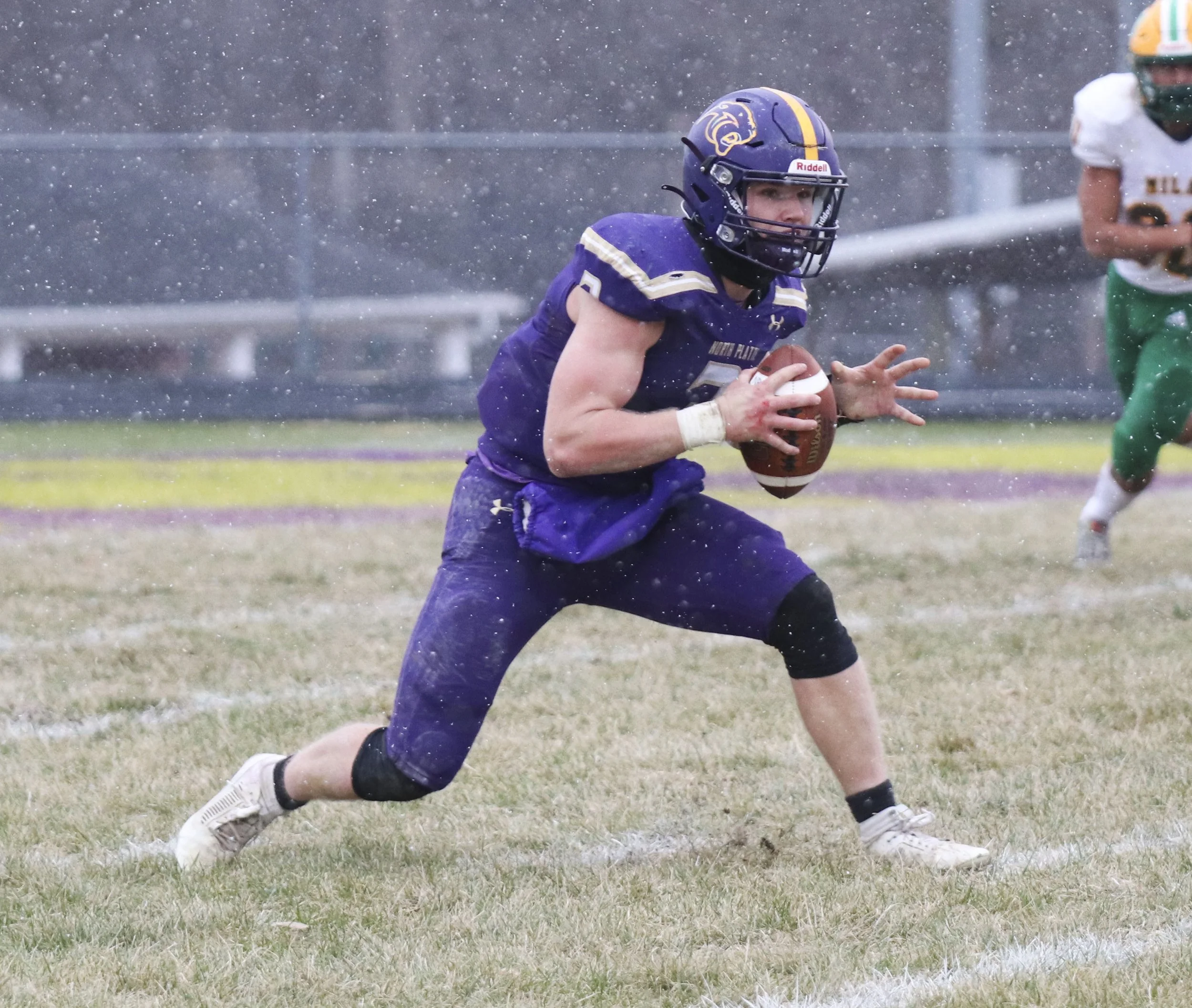North Platte senior quarterback Colton Kirkham runs in the second half of the snowy Class 1 State Semifinals as the Panthers defeated Milan 54-34 on Nov. 25.