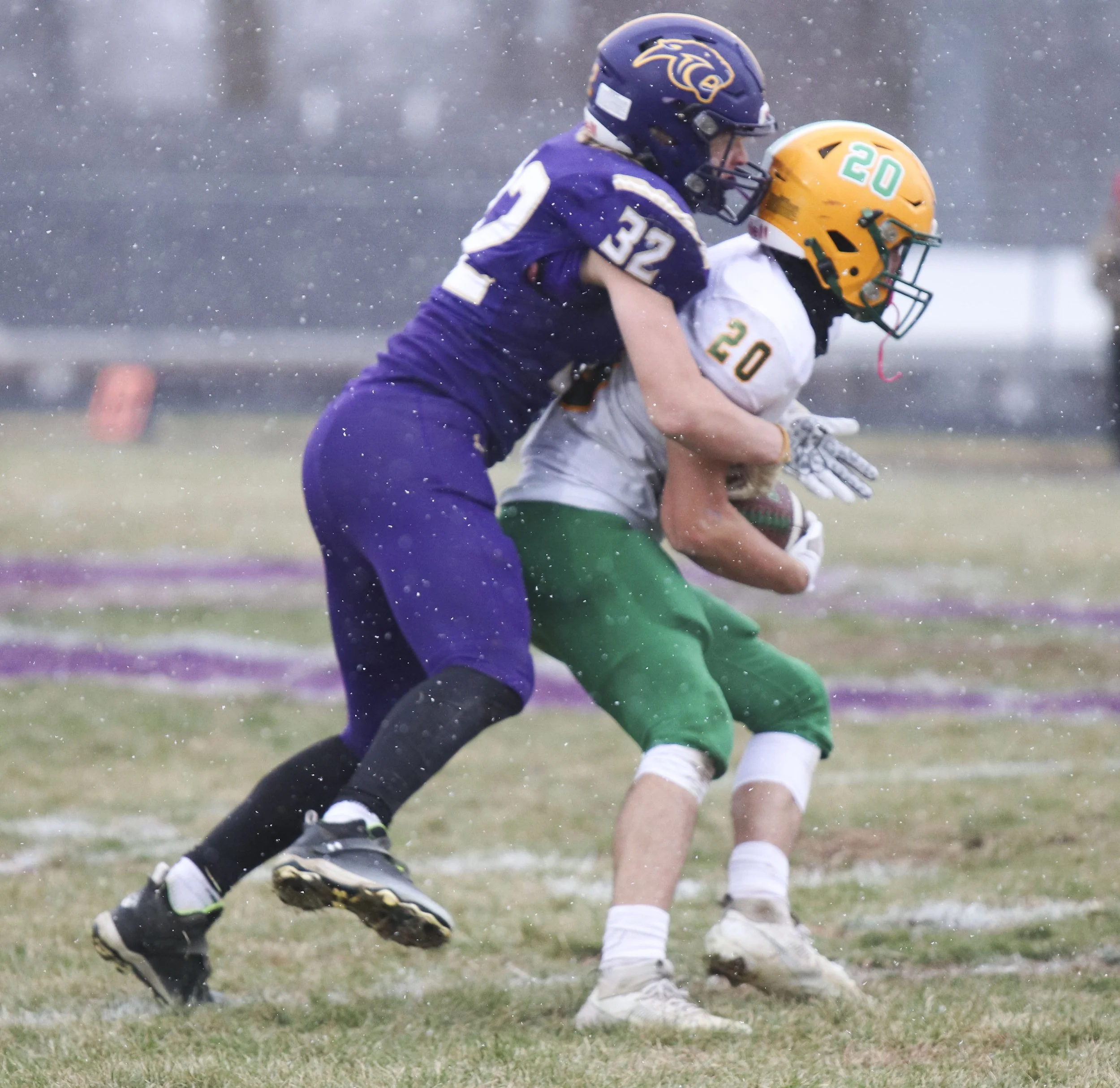 North Platte junior Waylon McCraken (#32) tackles Milan junior Keaton Weter (#20) in the Class 1 State Semifinal.