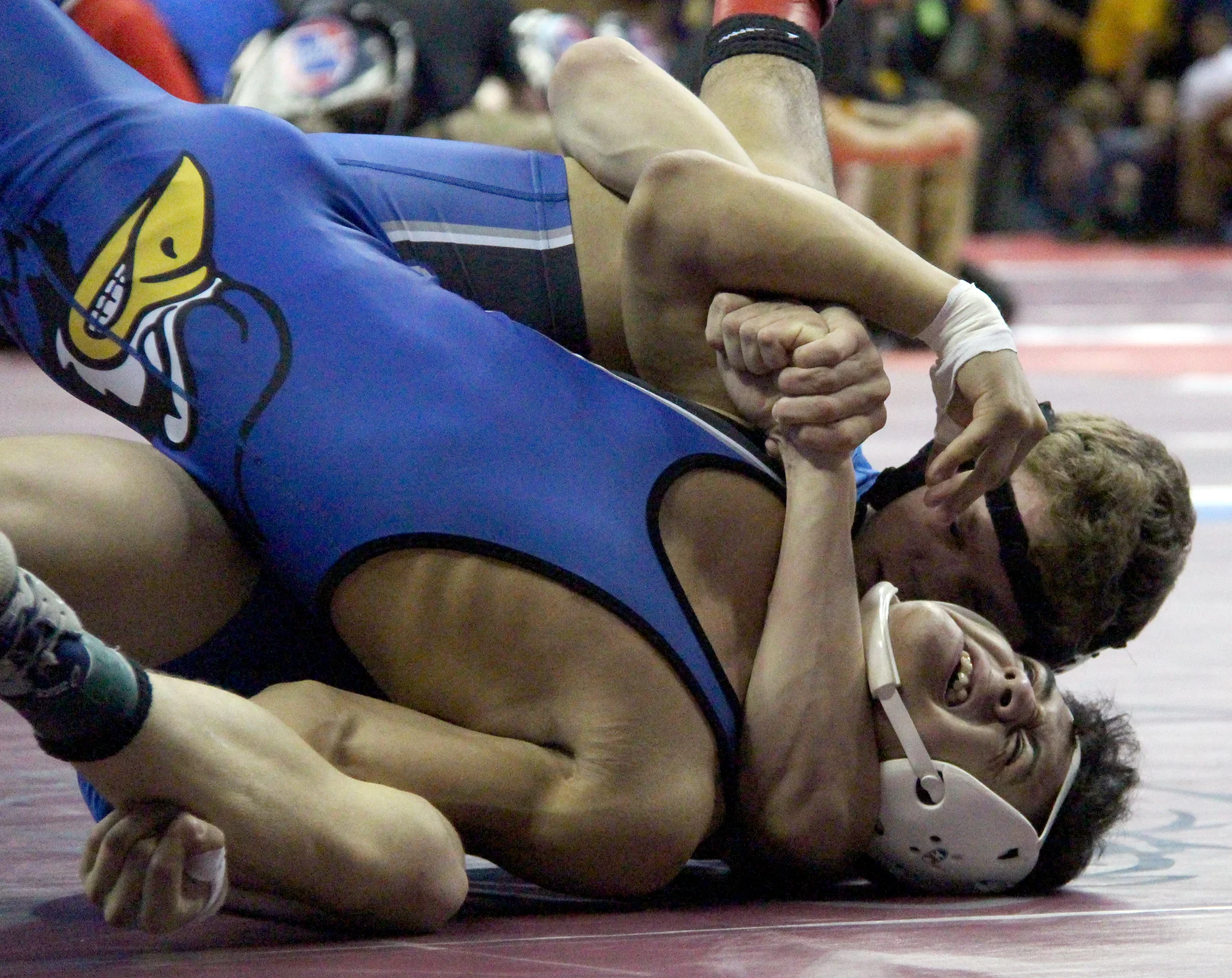 West Platte junior Brayan Rodriguez, front, tries to fight out of a cradle in a 132-pound first round match Thursday, Feb. 16 at Mizzou Arena in Columbia, Mo. against Valle Catholic’s Trey Huck.