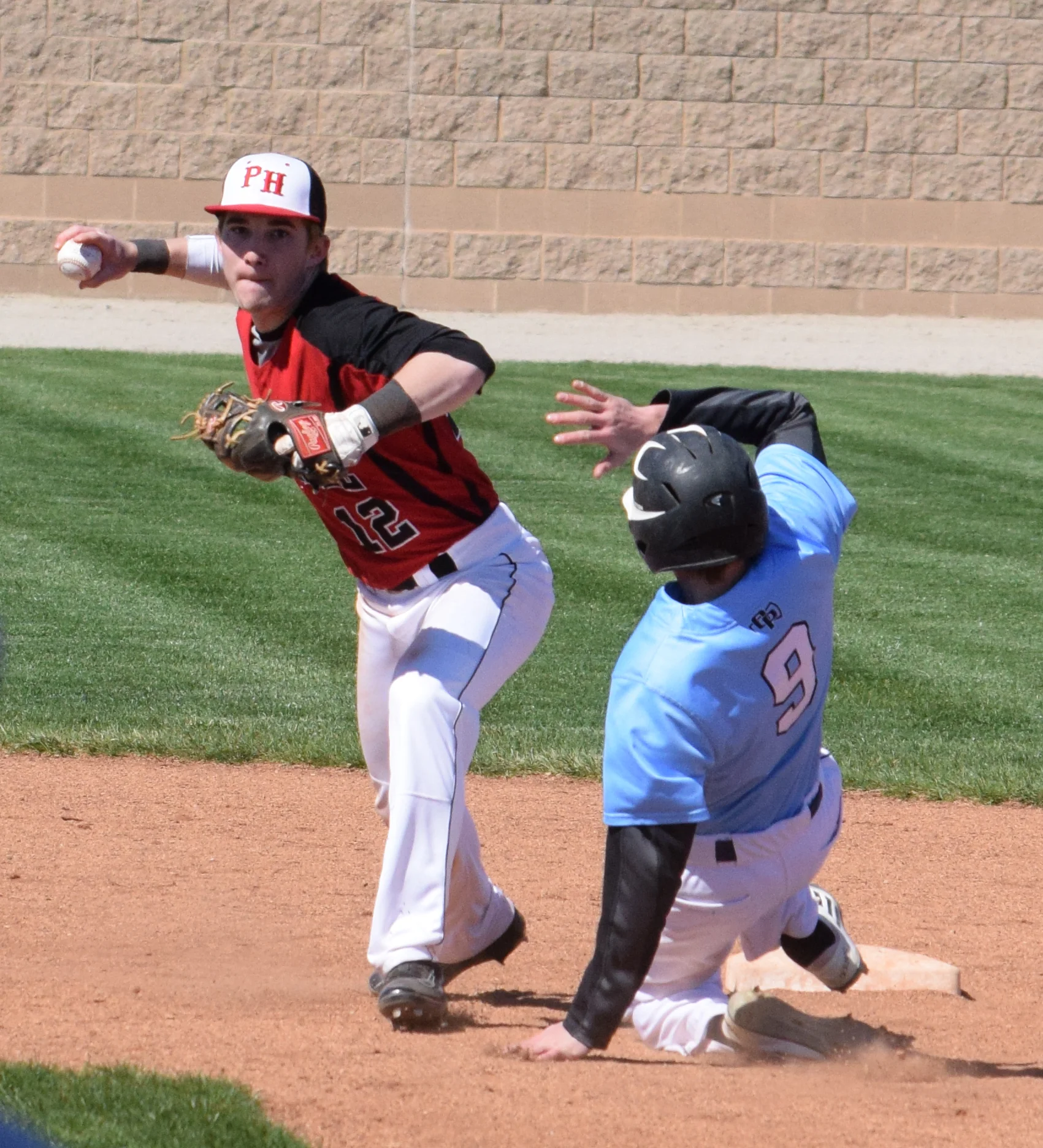 Park Hill senior shortstop Chase McCollom attempts to turn a double play against Oak Park on Saturday, April 2 at Park Hill High School in Kansas City, Mo. Park Hill went on to split the scheduled doubleheader with a 9-8 win and a 3-0 loss.