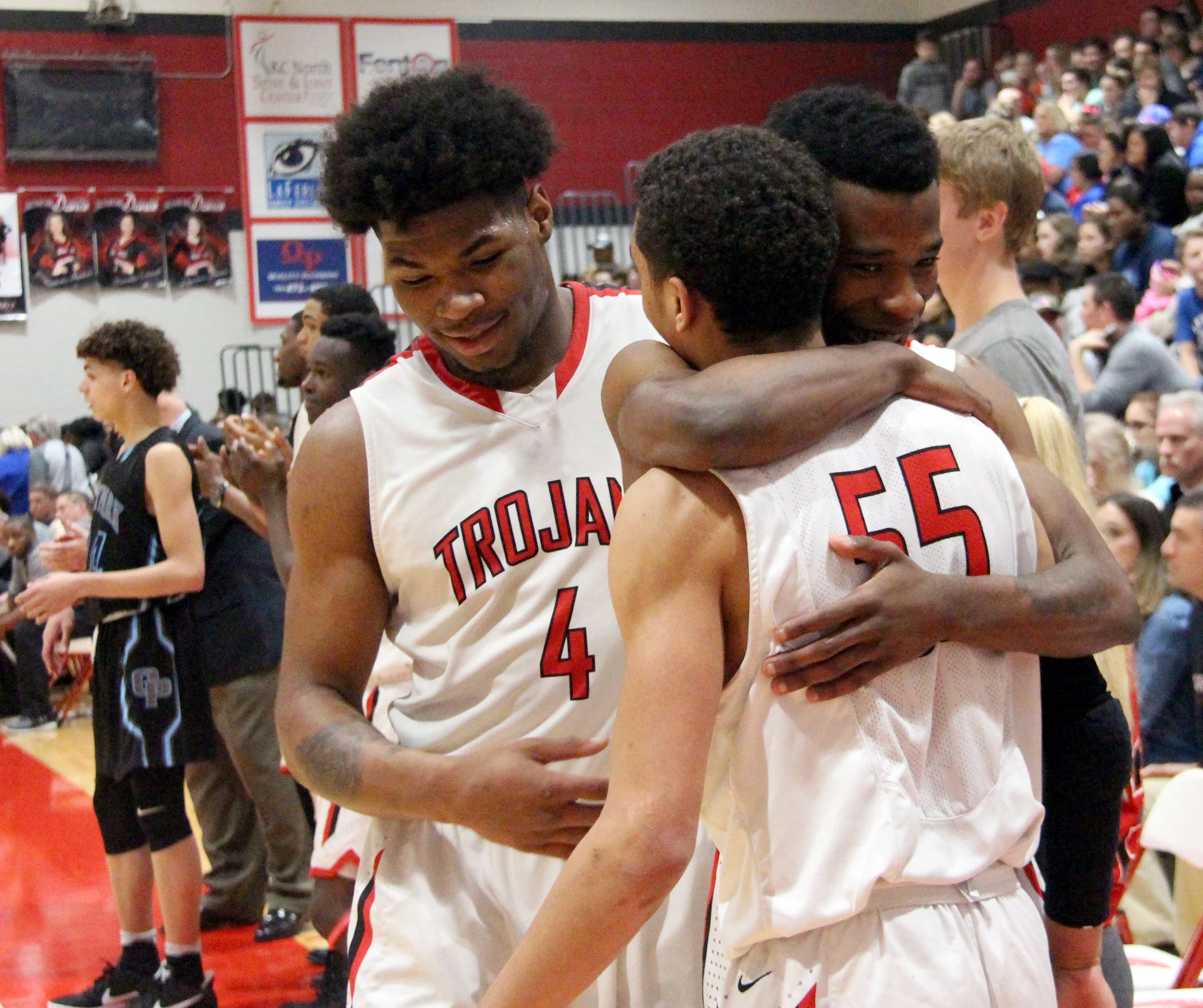 Park Hill senior Dru Smith hugs junior teammate Ronnie Bell (55) while celebrating with senior Chester Graves (4) late in the Class 5 District 16 championship game Friday, March 3 at Park Hill High School in Kansas City, Mo.