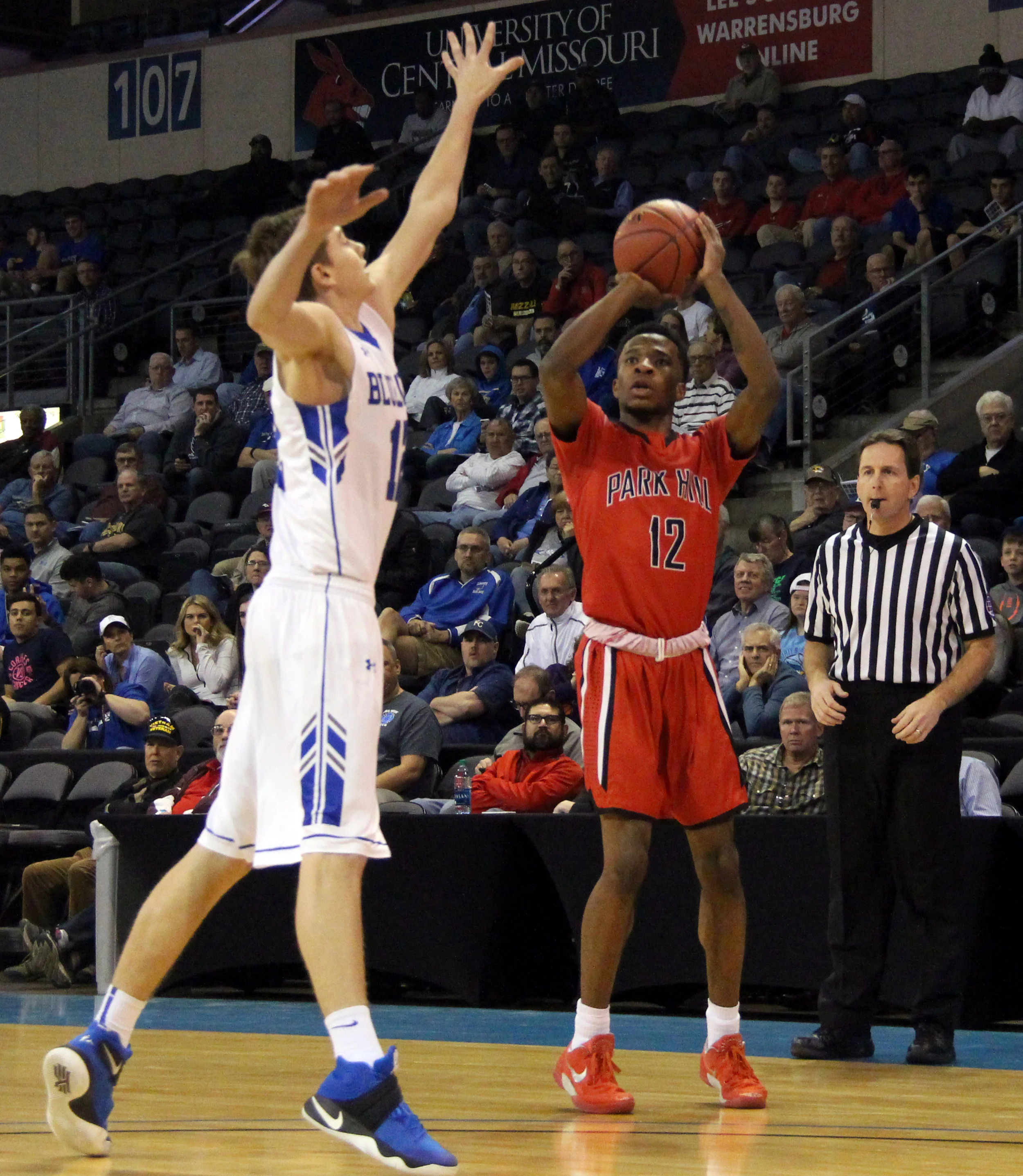 Park Hill senior guard Dru Smith, right, takes a 3-point shot over a Liberty defender Wednesday, March 8 in a Class 5 sectional at Silverstein Eye Centers Arena in Independence, Mo.