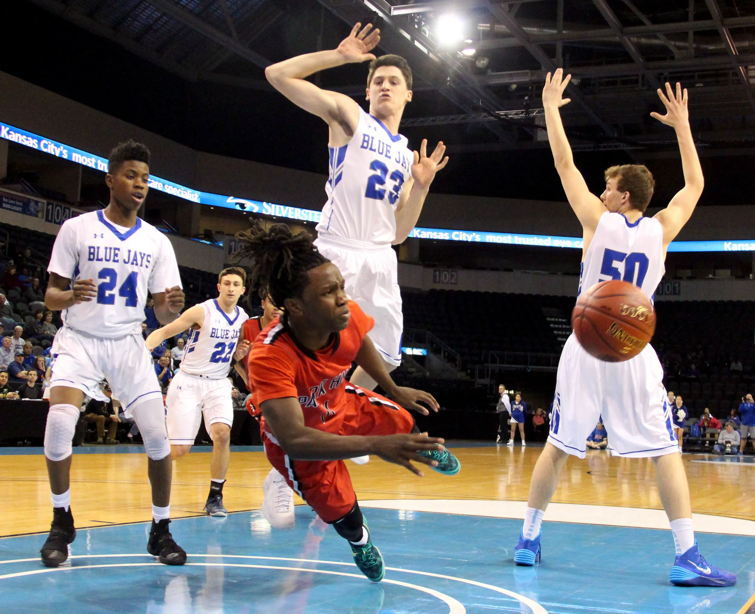 Park Hill junior guard Willy Majok (center) throws a pass as he falls to the floor Wednesday, March 8 in a Class 5 sectional vs. Liberty at Silverstein Eye Centers Arena in Independence, Mo.