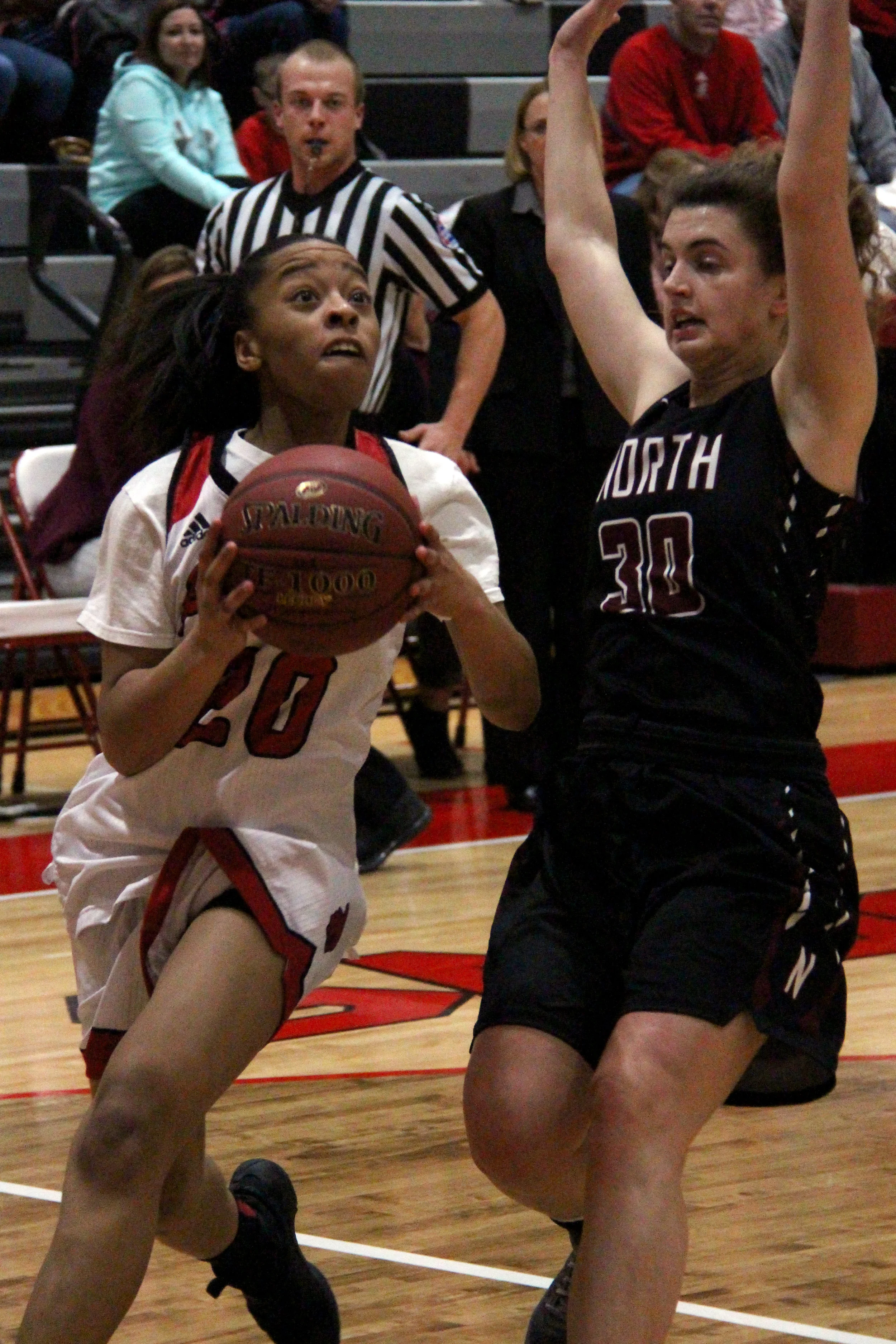 Park Hill sophomore guard Tee Tee Bryant, left, tries to go past a Lee’s Summit North defender on Monday, Feb. 6 at Park Hill High School in Kansas City, Mo.
