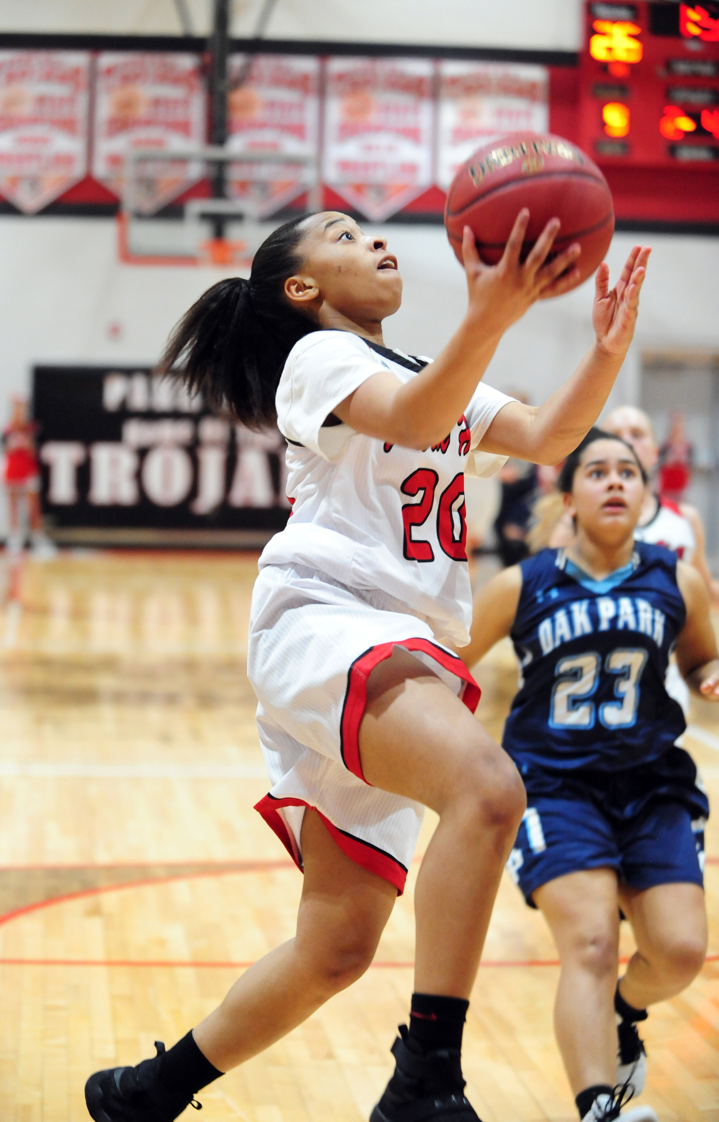 Park Hill sophomore Tee Tee Bryant, left, goes in for a layup against Oak Park in a Class 5 District 16 semifinal Monday, Feb. 27 at Park Hill High School in Kansas City, Mo..