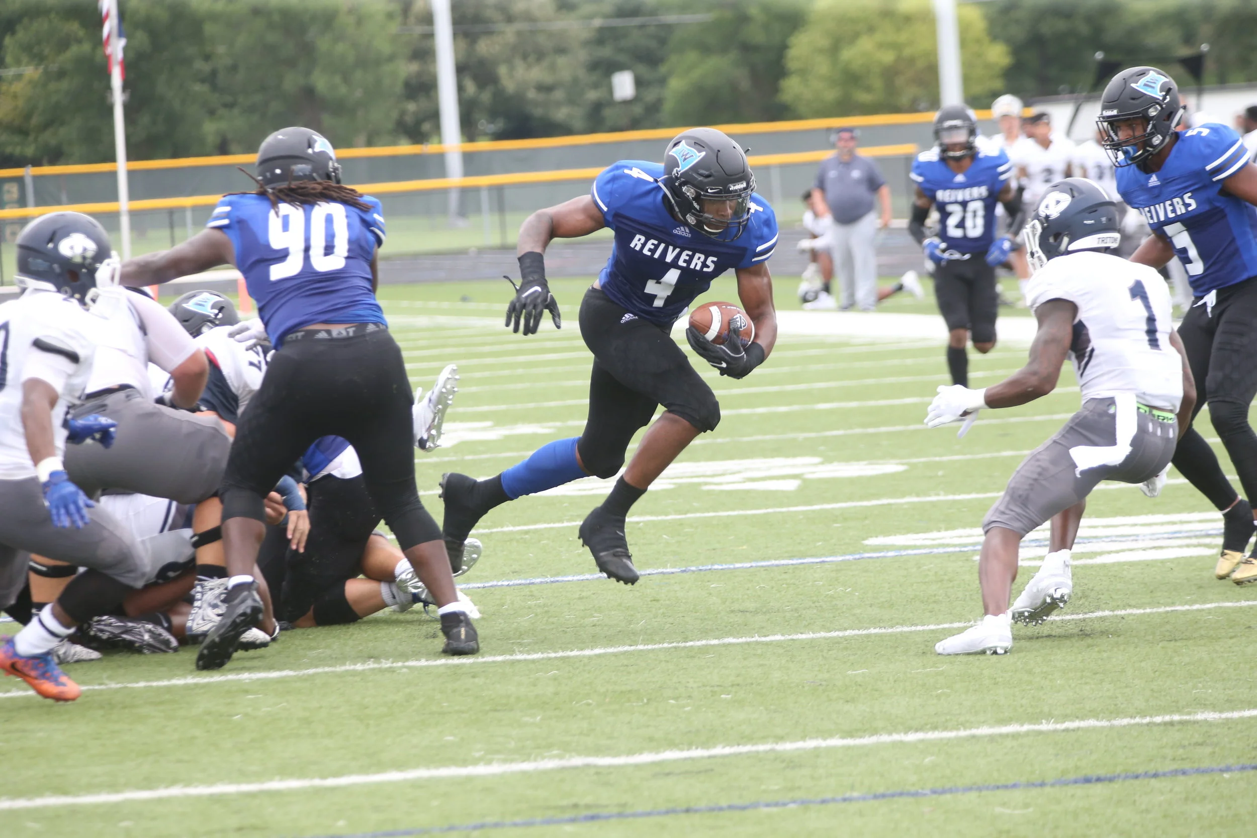 Iowa Western Community College’s Chester Graves (4) returns a fumble against Iowa Central during a game this past fall.