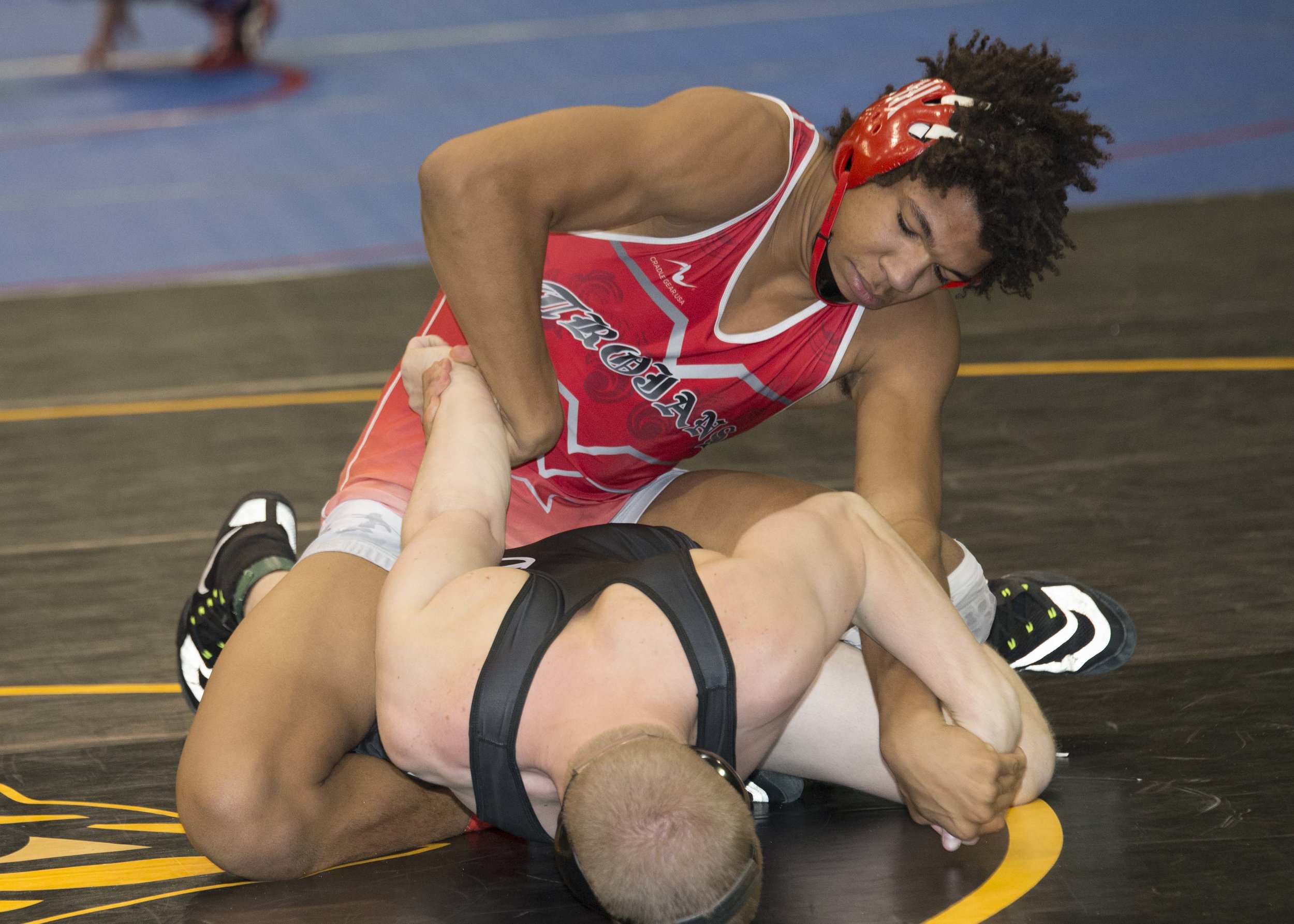 Park Hill sophomore Devin Winston, top, controls an opponent in a 170-pound match during the Kansas City Stampede tournament over the weekend at Hale Arena in Kansas City, Mo.