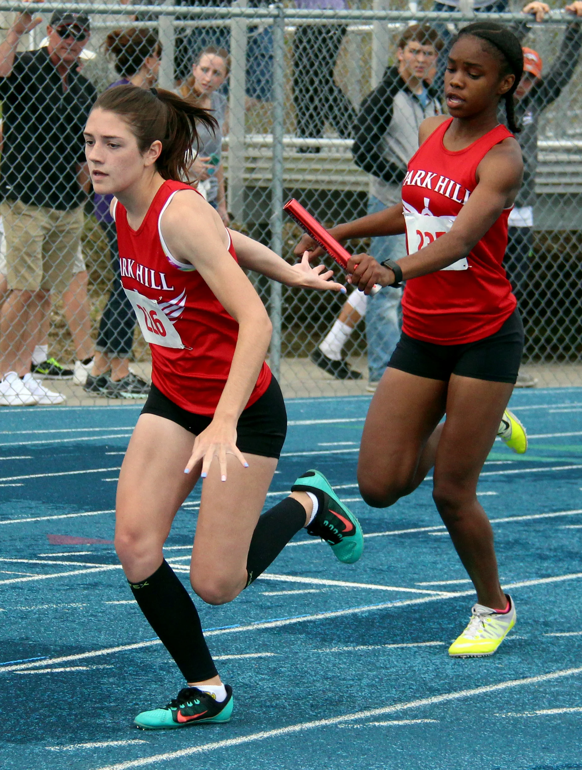 Park Hill junior Taiya Shelby, right, hands the baton to junior Jena Hahlbeck during the Class 5 Sectional 4 4x200-meter relay Saturday, May 20 at Blue Springs South High School in Blue Springs, Mo.