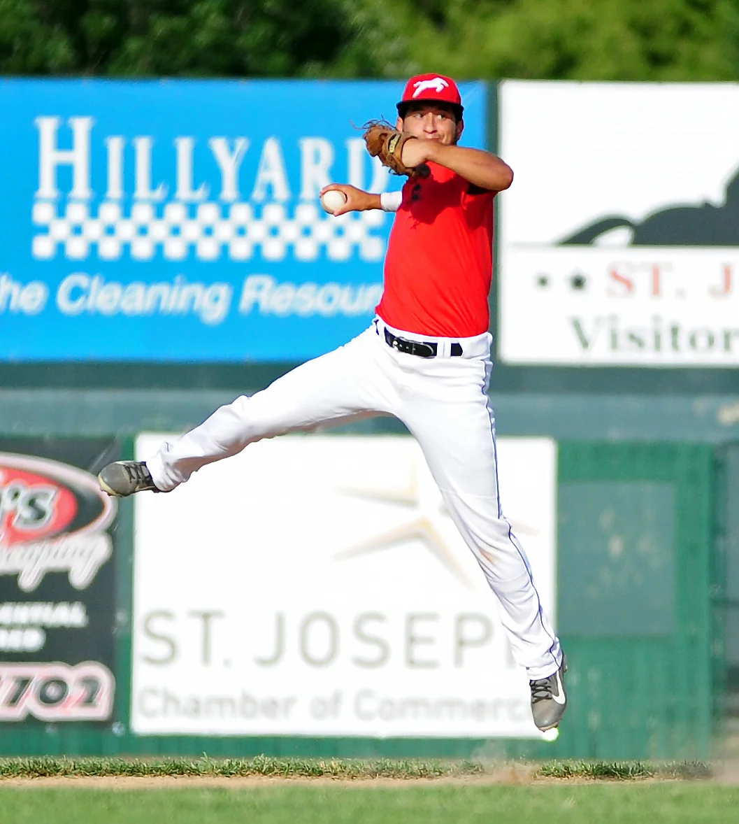 Park Hill South graduate Easton Fortuna makes a leaping throw to first base during infield practice for the St. Joseph Mustangs on Wednesday, June 7 at Phil Welch Stadium in St. Joseph, Mo.