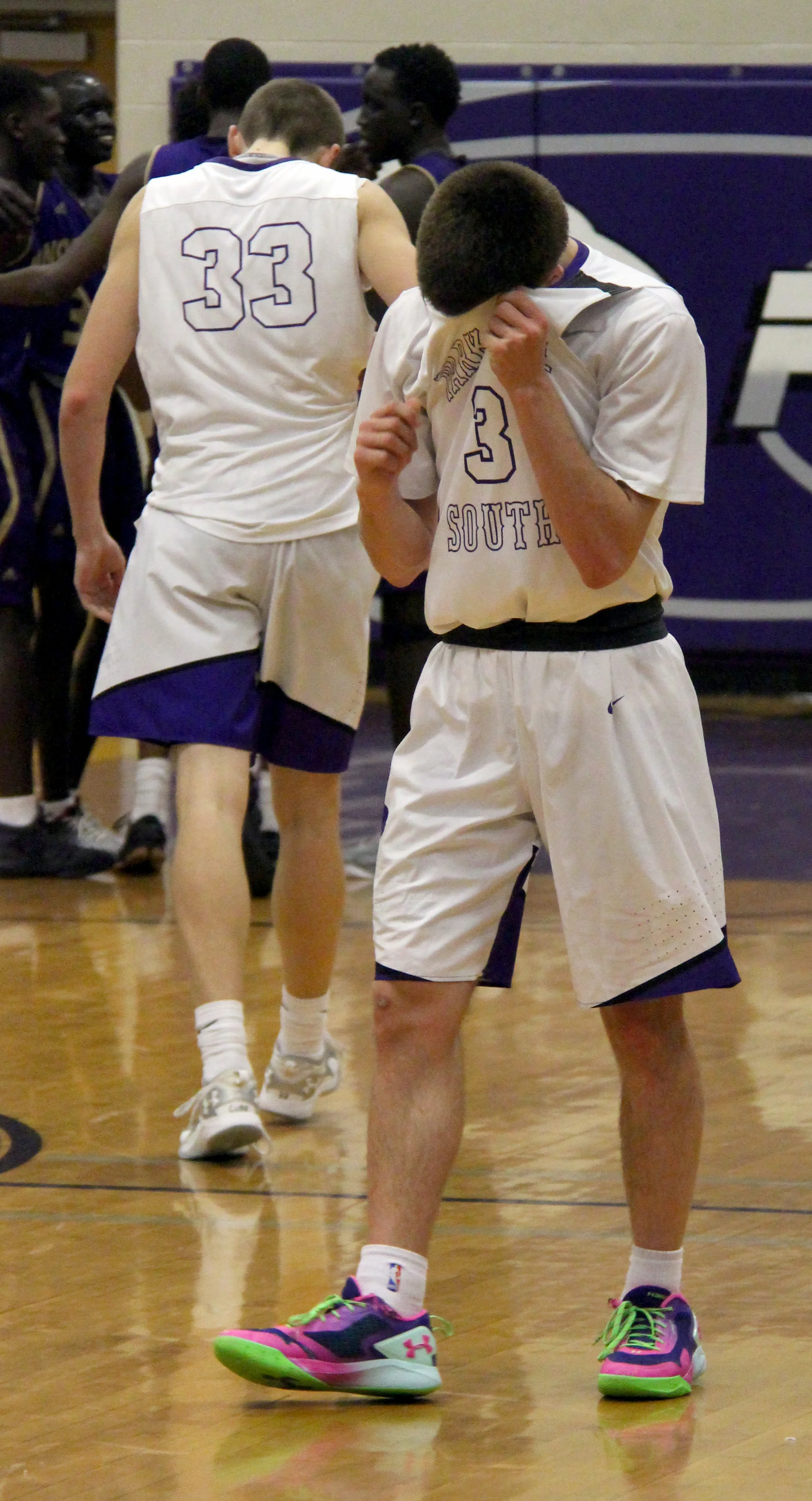 Park Hill South senior guard Jacob Kline (3) wipes his face as fellow senior Connor Lee walks away late in a Class 5 District 14 semifinal loss to North Kansas City on Thursday, March 2 at Park Hill South High School in Riverside, Mo.