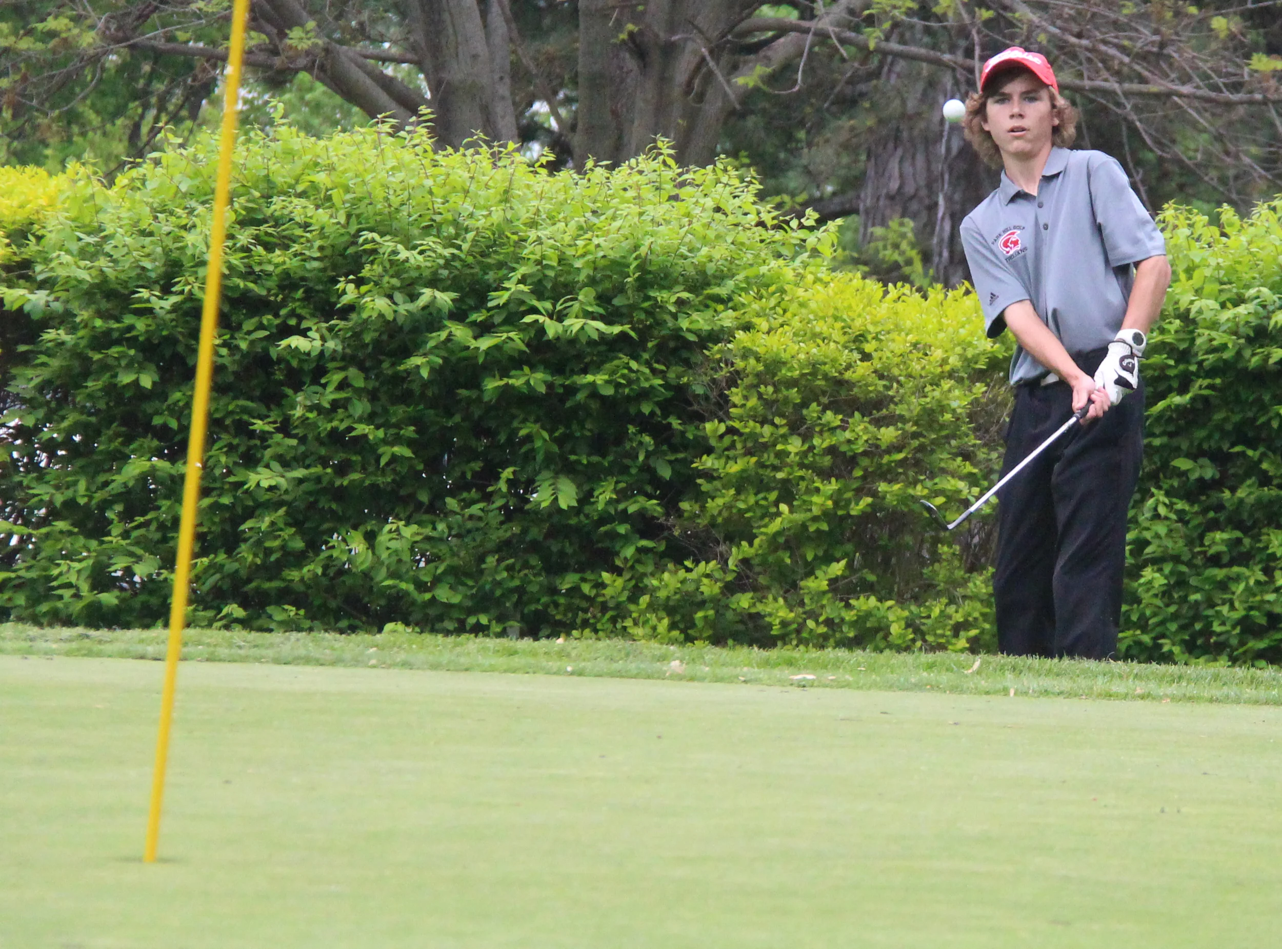 Park Hill junior Kris Snodgrass watches a chip shot at the Suburban Conference Red Division championships held Monday, April 25 at Moila Country Club in St. Joseph, Mo.