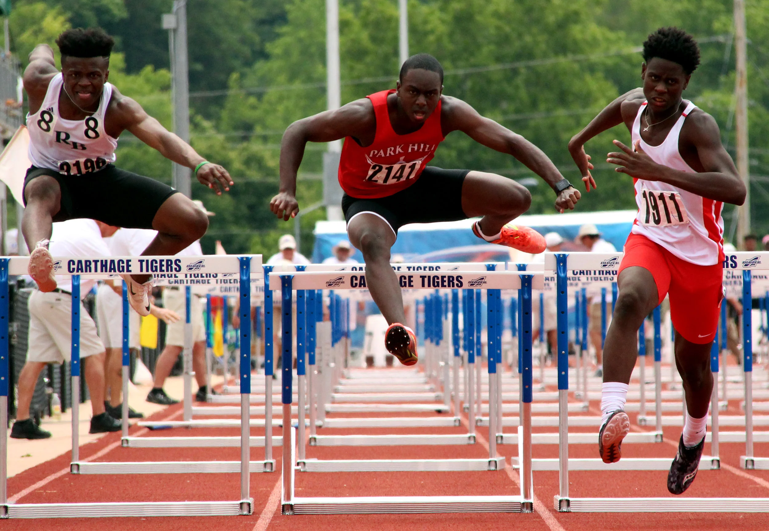 Park Hill senior Grant Downes, center, runs in the Class 5 Missouri State Track and Field Championships’ 110-meter hurdles final Saturday, May 27 at Adkins Stadium in Jefferson City, Mo.