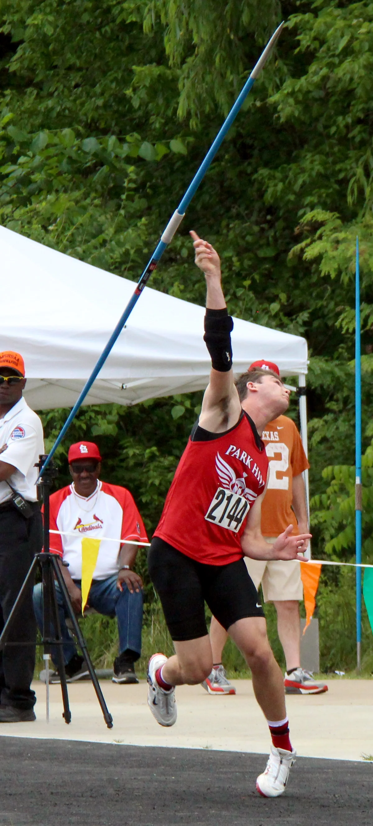 Park Hill sophomore Kolby Heinerikson takes an attempt in the javelin Friday, May 26.