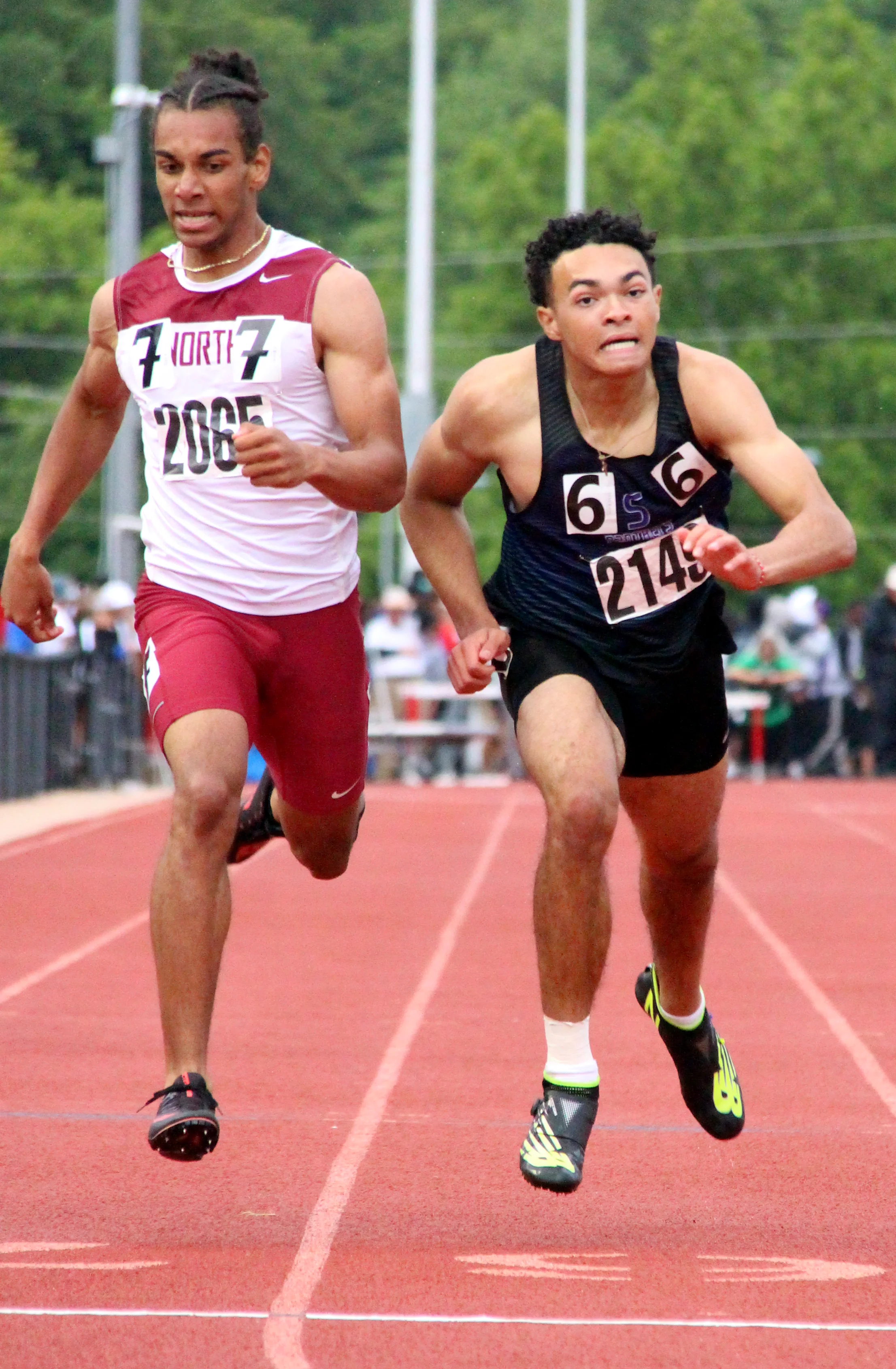Park Hill South freshman Chris Dupree leans for the line in the Class 5 400-meter final, finishing second to Lee’s Summit North junior Todd Pinkowski, left.
