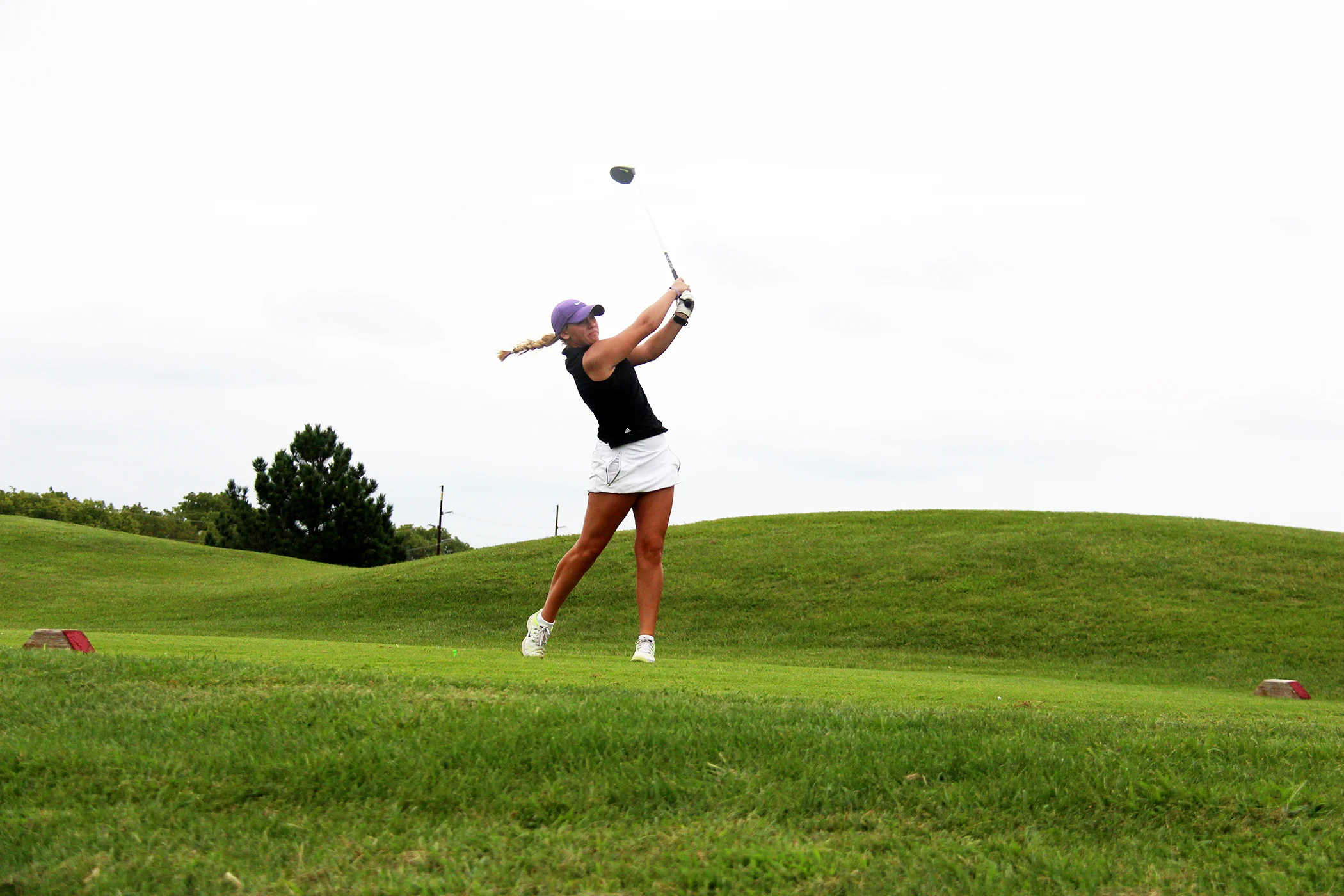 Park Hill South senior Miranda Steczak watches her shot off the 10th tee during the Pirate Invitational on Wednesday, Sept. 7 at Shiloh Springs Golf Course. Steczak finished third.