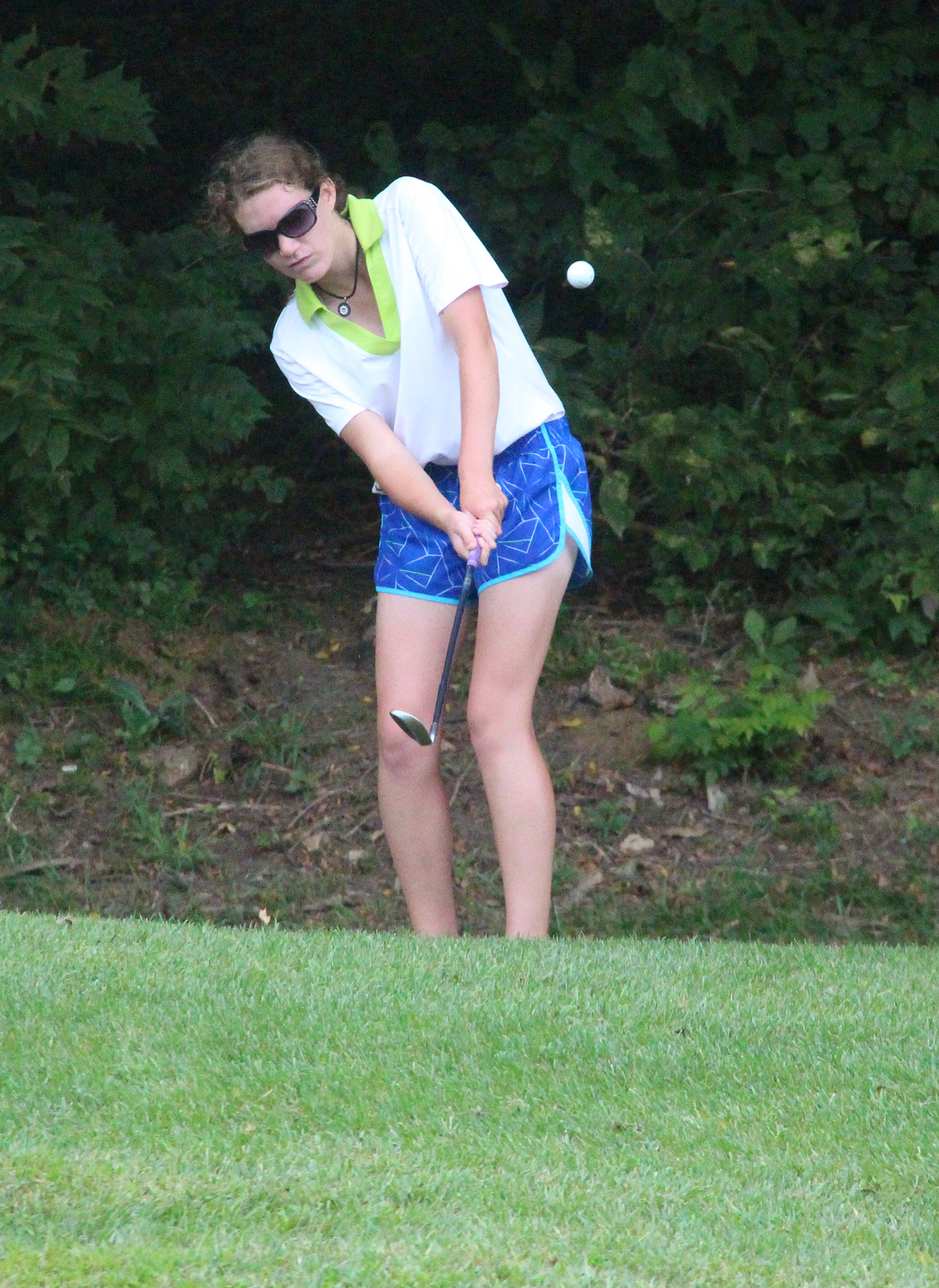Platte County sophomore Kasydie Shipp hits a chip on No. 8 toward the green.
