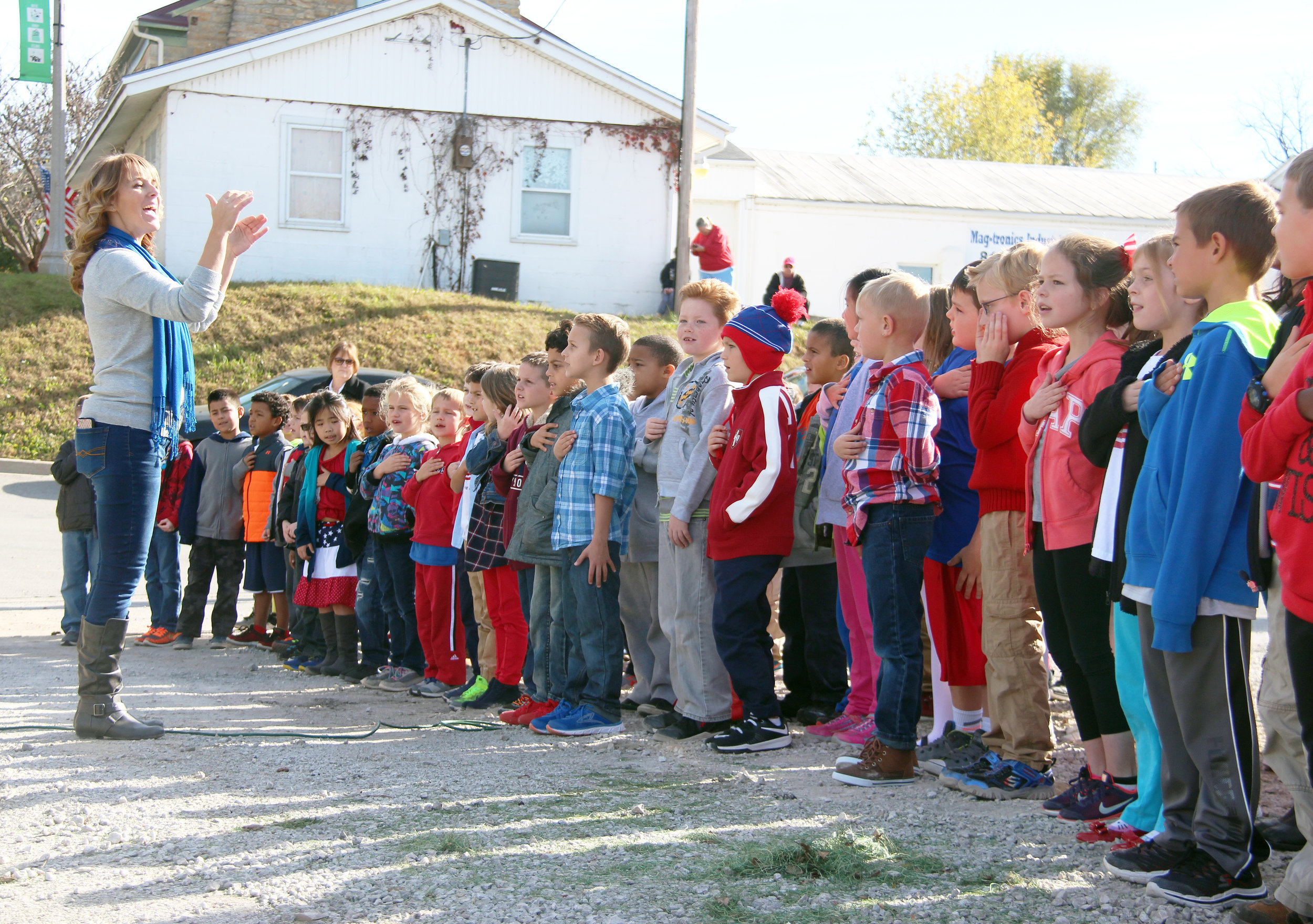 Second grade students from Pathfinder Elementary sang as a prelude to a Veterans Day ceremony held Friday, Nov. 11 at Settler’s Crossing Park in Platte City. The City of Platte City officially dedicated its first monument for veterans.