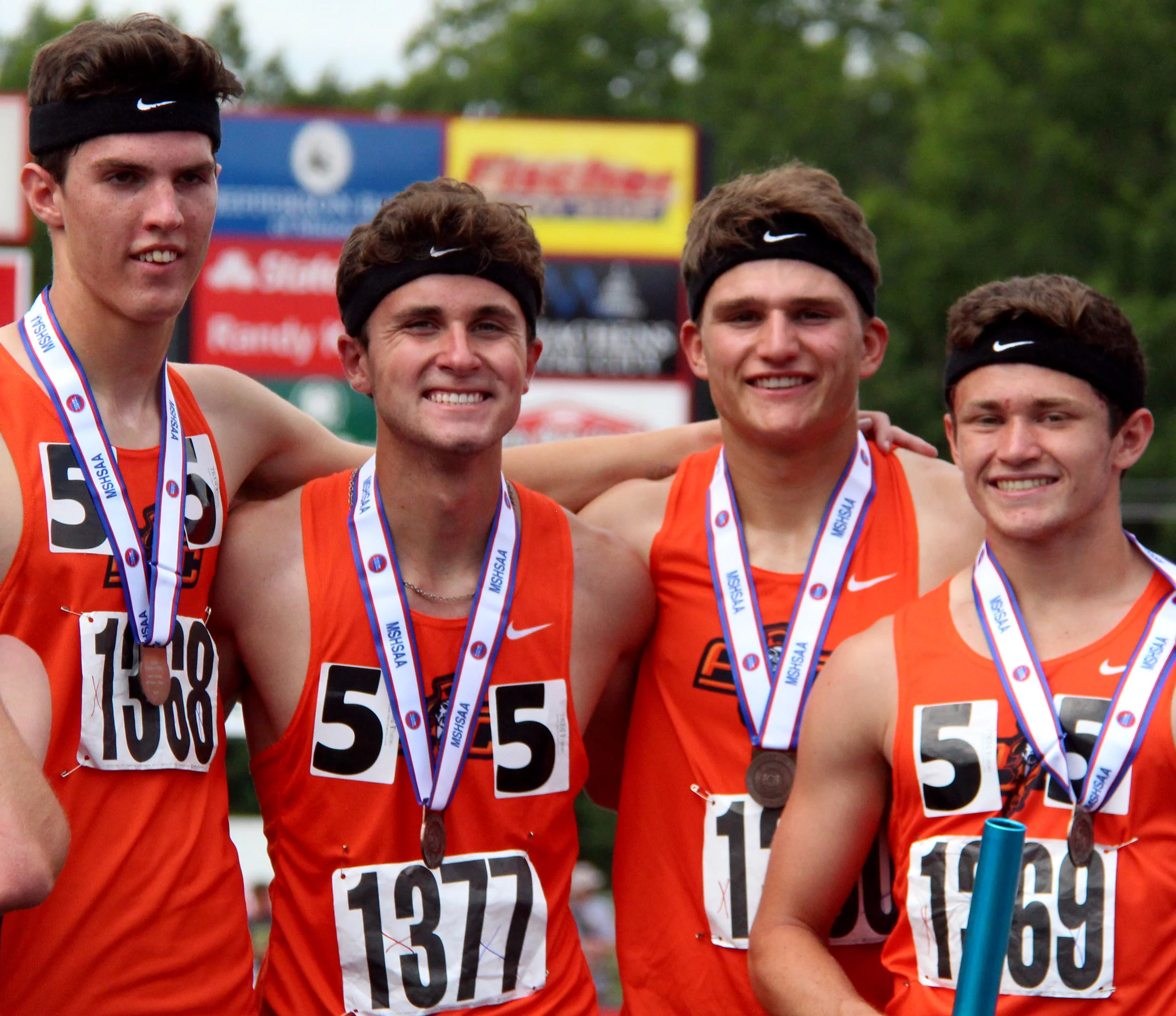 Platte County’s 4x800-meter relay team of (from left) sophomore Keegan Cordova, senior Jared Maksudian, junior Devin Richardson and senior JD Crawford placed third in the race Saturday, May 27 during the Class 4 Missouri State Track and Field Championships at Adkins Stadium in Jefferson City, Mo.
