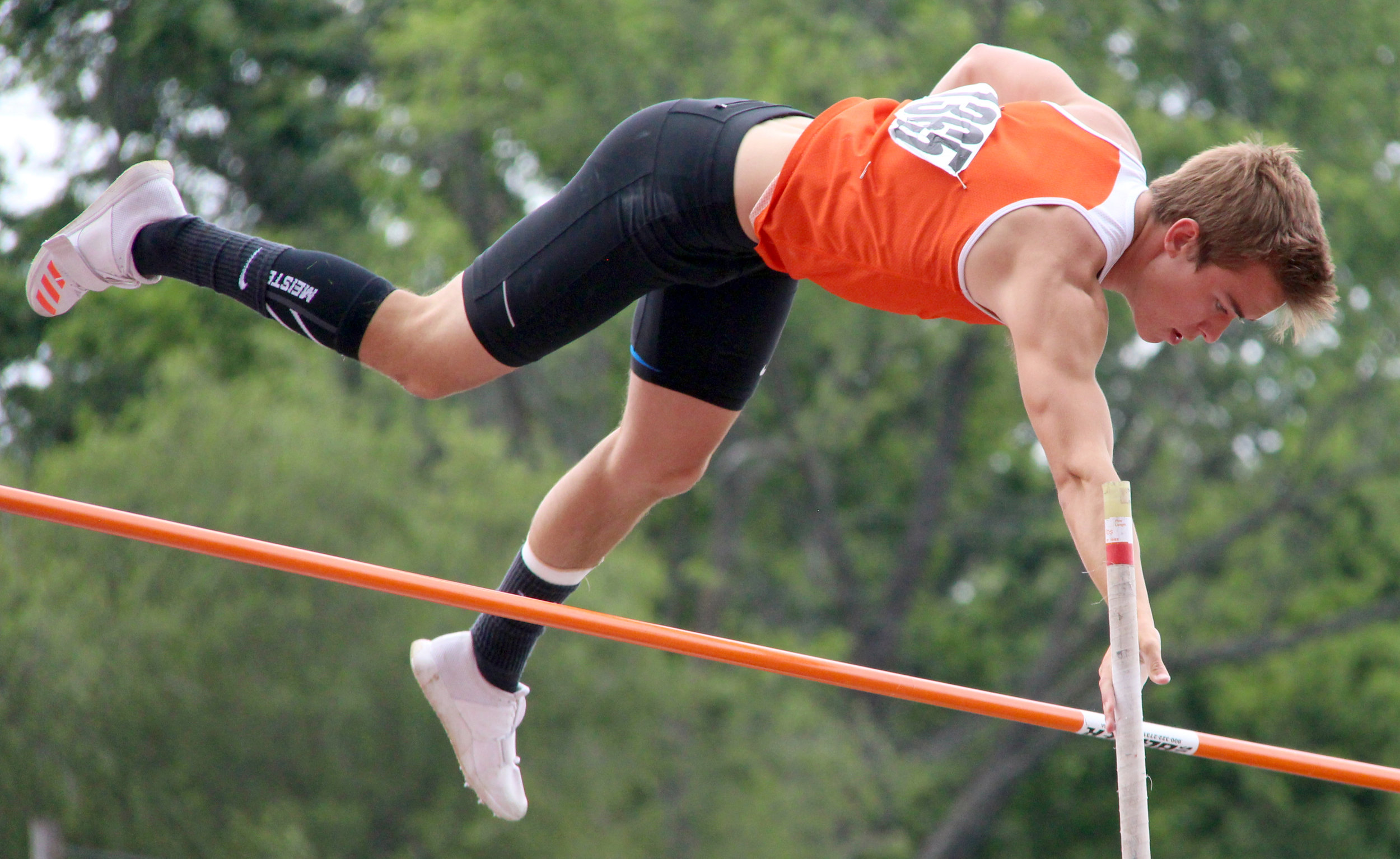 Platte County senior Bryce Bearden clears the bar during the Class 4 Missouri State Track and Field Championships’ pole vault competition Saturday, May 27 at Adkins Stadium in Jefferson City, Mo.