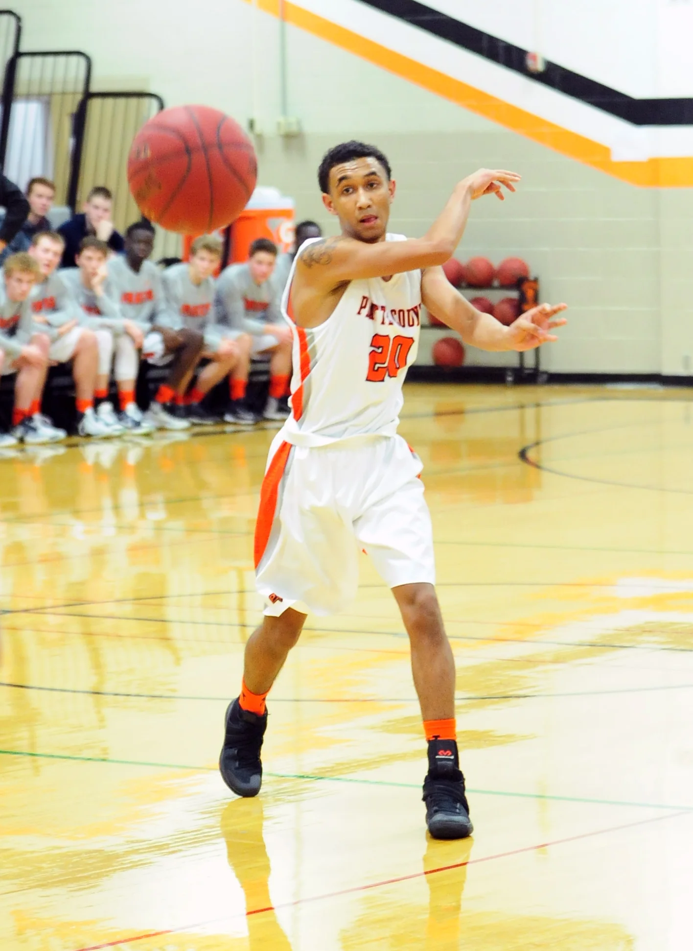 Platte County senior guard DeAndre Rollins whips a pass to a teammate in the Pirates’ loss to Kearney on Friday, Jan. 6 at Platte County High School.