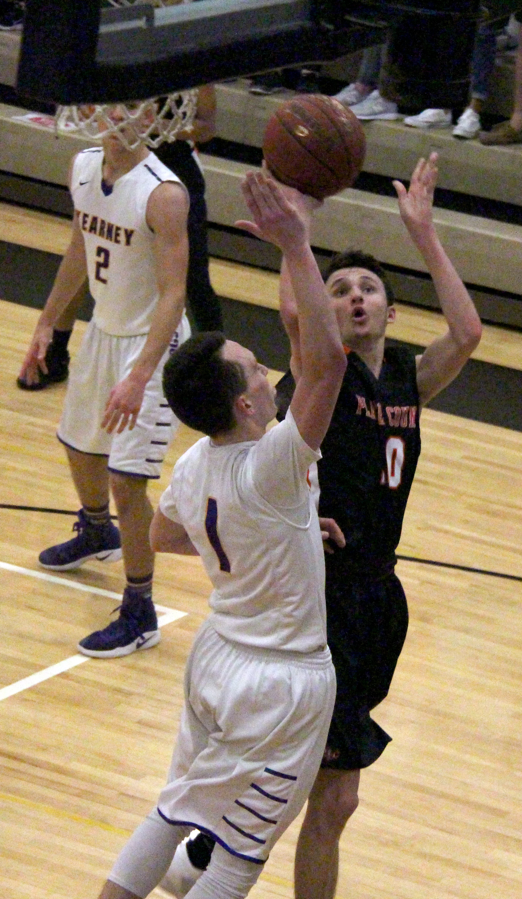 Platte County senior guard Tanner Newberry, right, goes up for a shot against Kearney senior Dylan Ritz (1) during the Class 4 District 15 title game Saturday, March 4 at Excelsior Springs High School in Excelsior Springs, Mo.