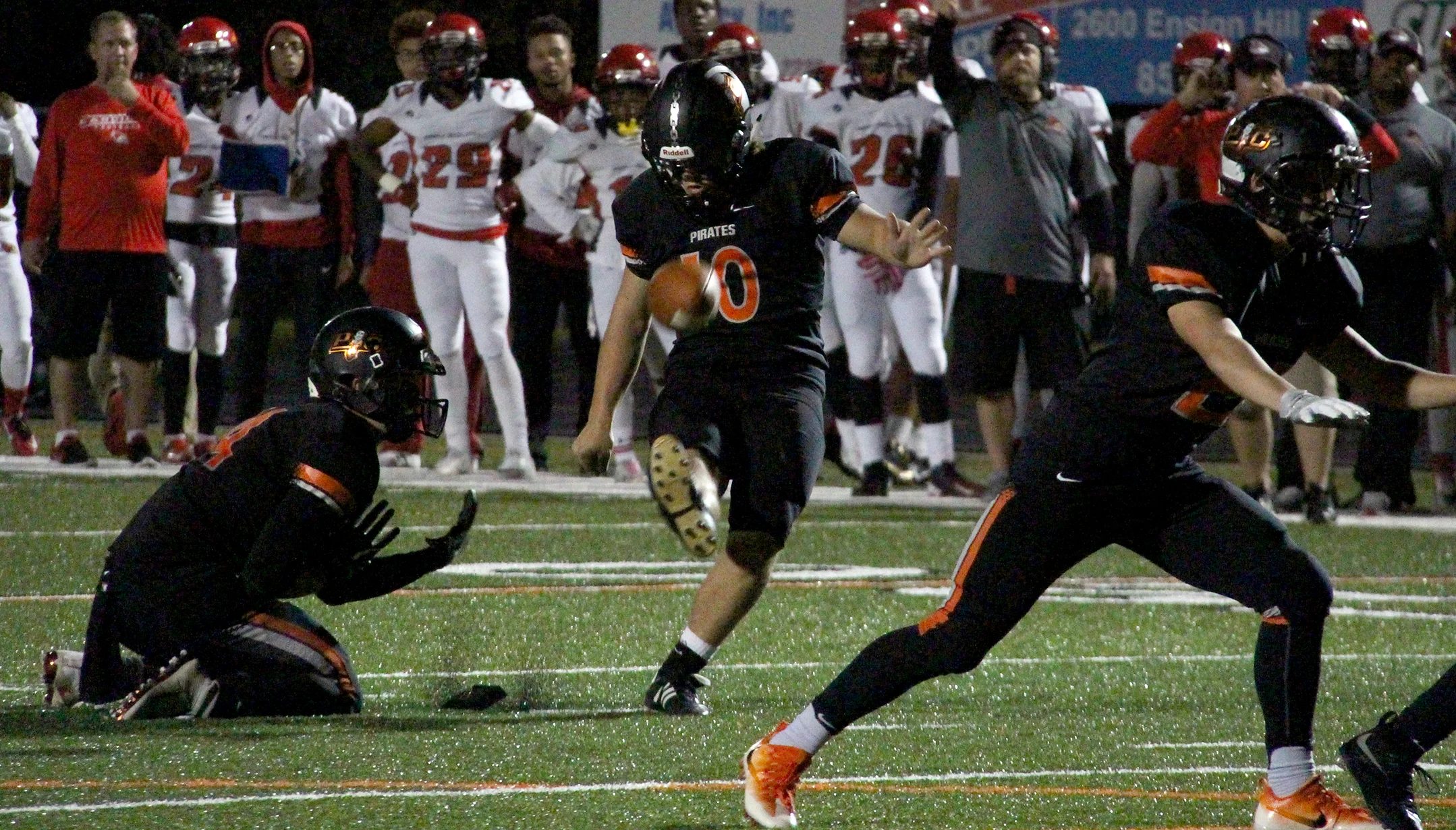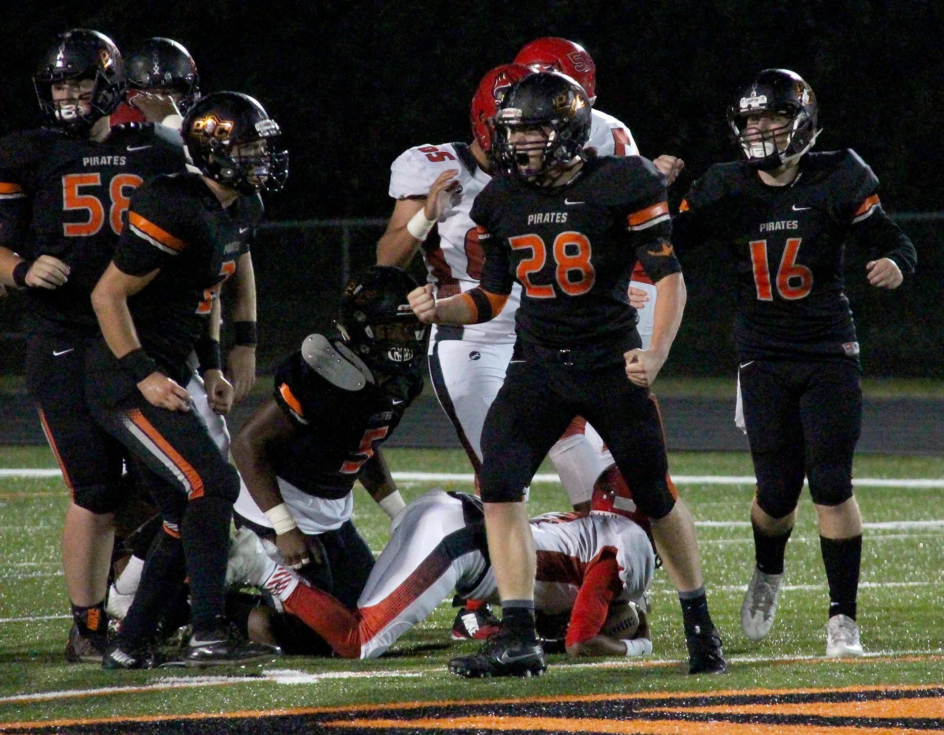Schmidt also recovered Hannah’s fumble on the first play of the second half, leading to Lacina’s 41-yard field goal four plays later. The Pirates defense has allowed nine or fewer points in four of the five wins, including two shutouts, with the lone exception a 38-30 victory against previously unbeaten Class 5 Liberty the week before Raytown South came to town.