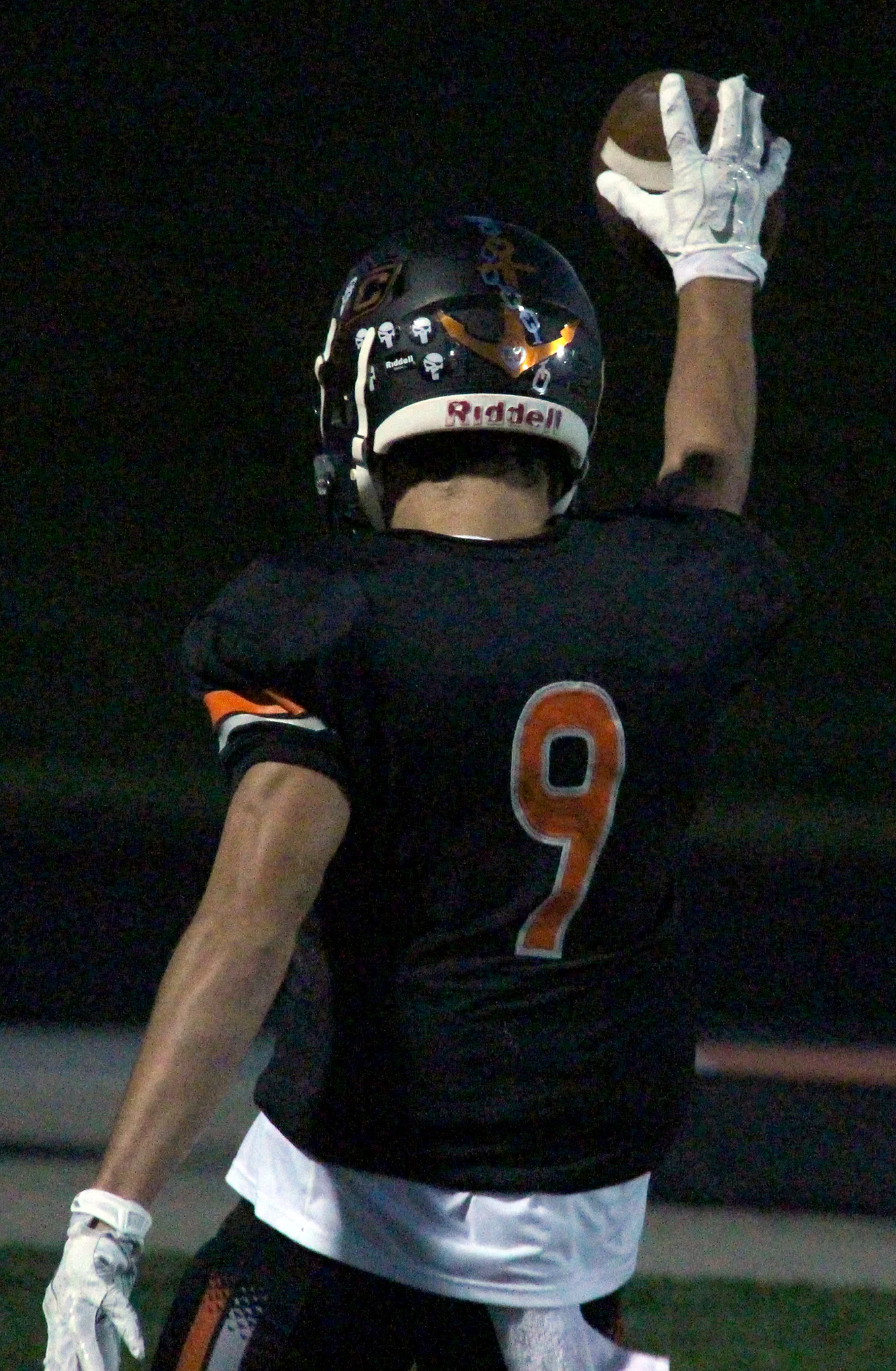 Platte County senior wide receiver TJ Guillory crosses the goal line with the first touchdown in the Pirates’ 30-9 win against Raytown South on Friday, Sept. 30 at Pirate Stadium.