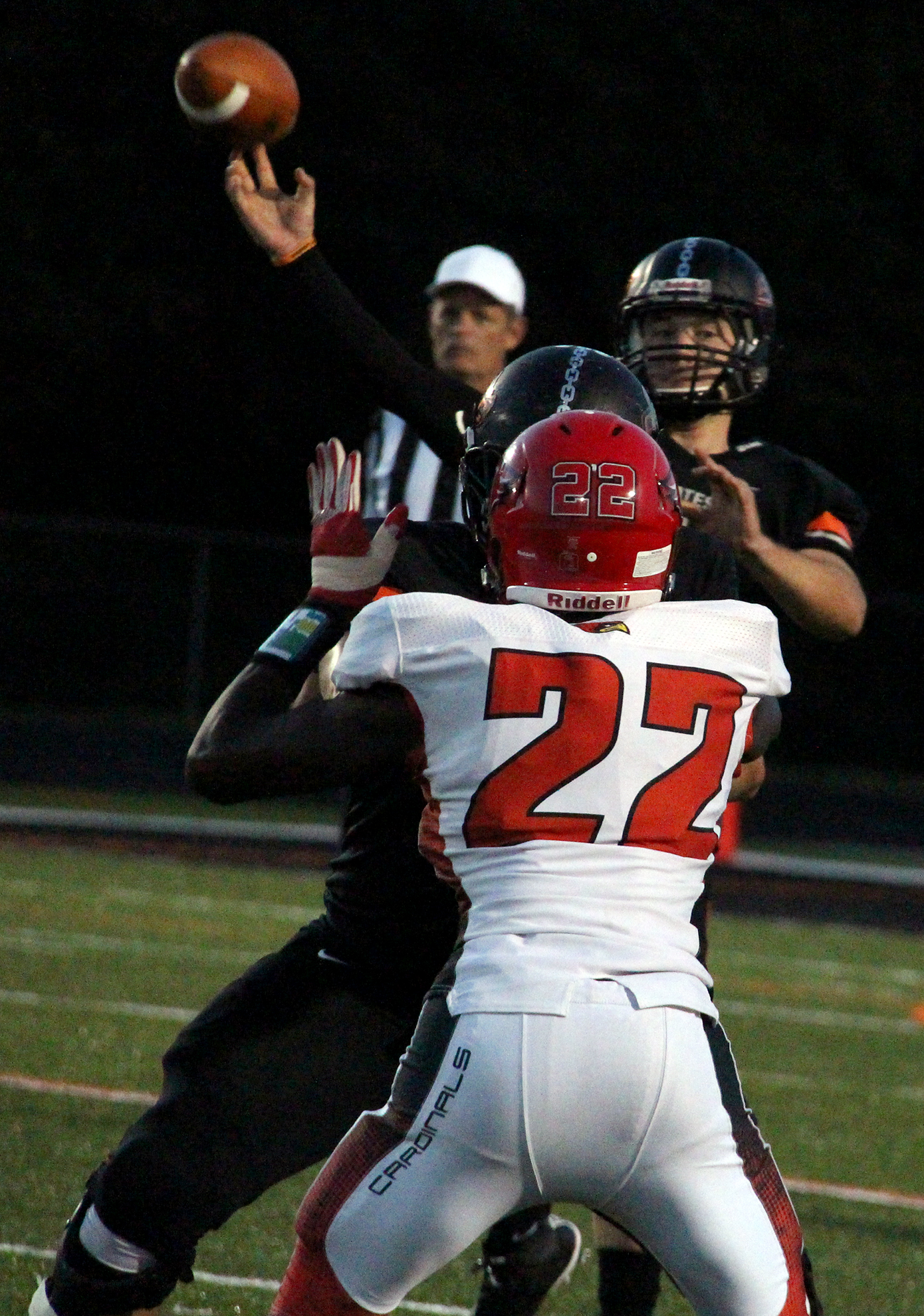 Platte County’s leading receiver in terms of catches each of the past two seasons, Guillory beat the Cardinals’ defense on a third-and-13 play with just more than a minute left in the first quarter. Pirates senior quarterback Justin Mitchell found him all alone on the home sideline for a 30-yard touchdown on a wheel route for a 7-0 early lead.