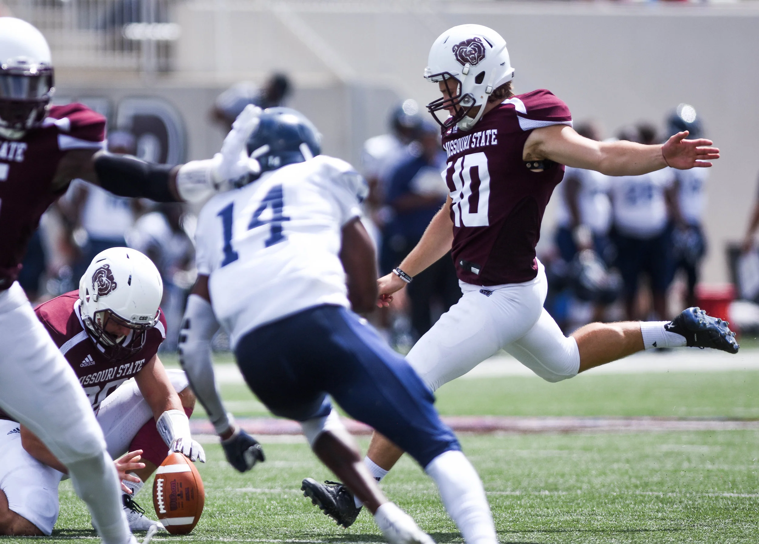 Missouri State kicker Parker Lacina, a 2018 graduate from Platte County High School, earned a starting spot as a walk-on. He is shown here kicking against Lincoln on Thursday, Aug. 30.
