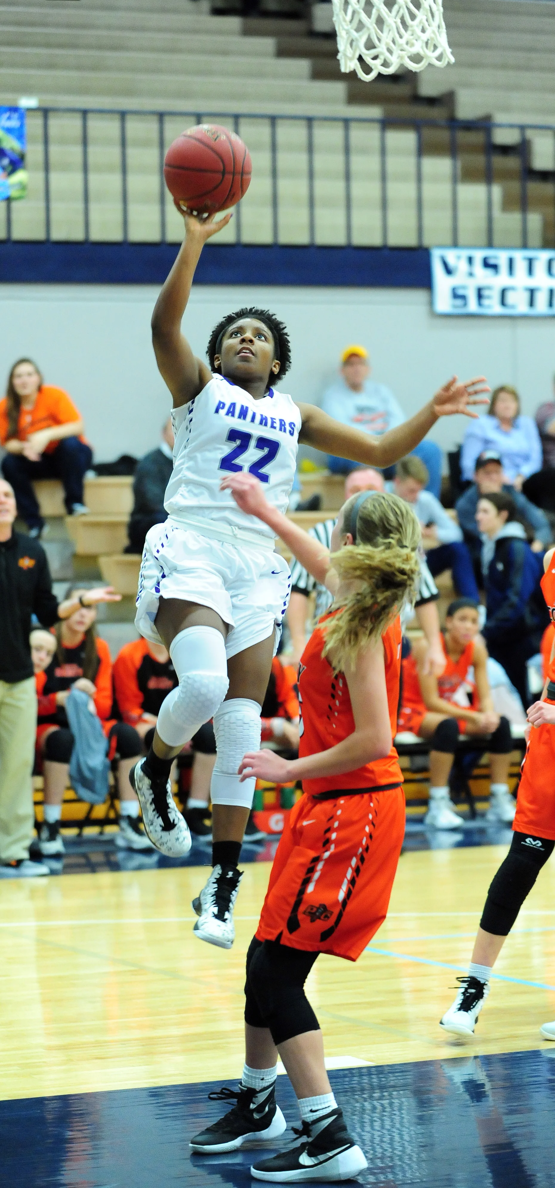 Park Hill South junior Dymeria Guillory (22) goes up for a layup during an Oak Park Invitational matchup with Platte County on Monday, Jan. 16 at Oak Park High School in Kansas City, Mo.