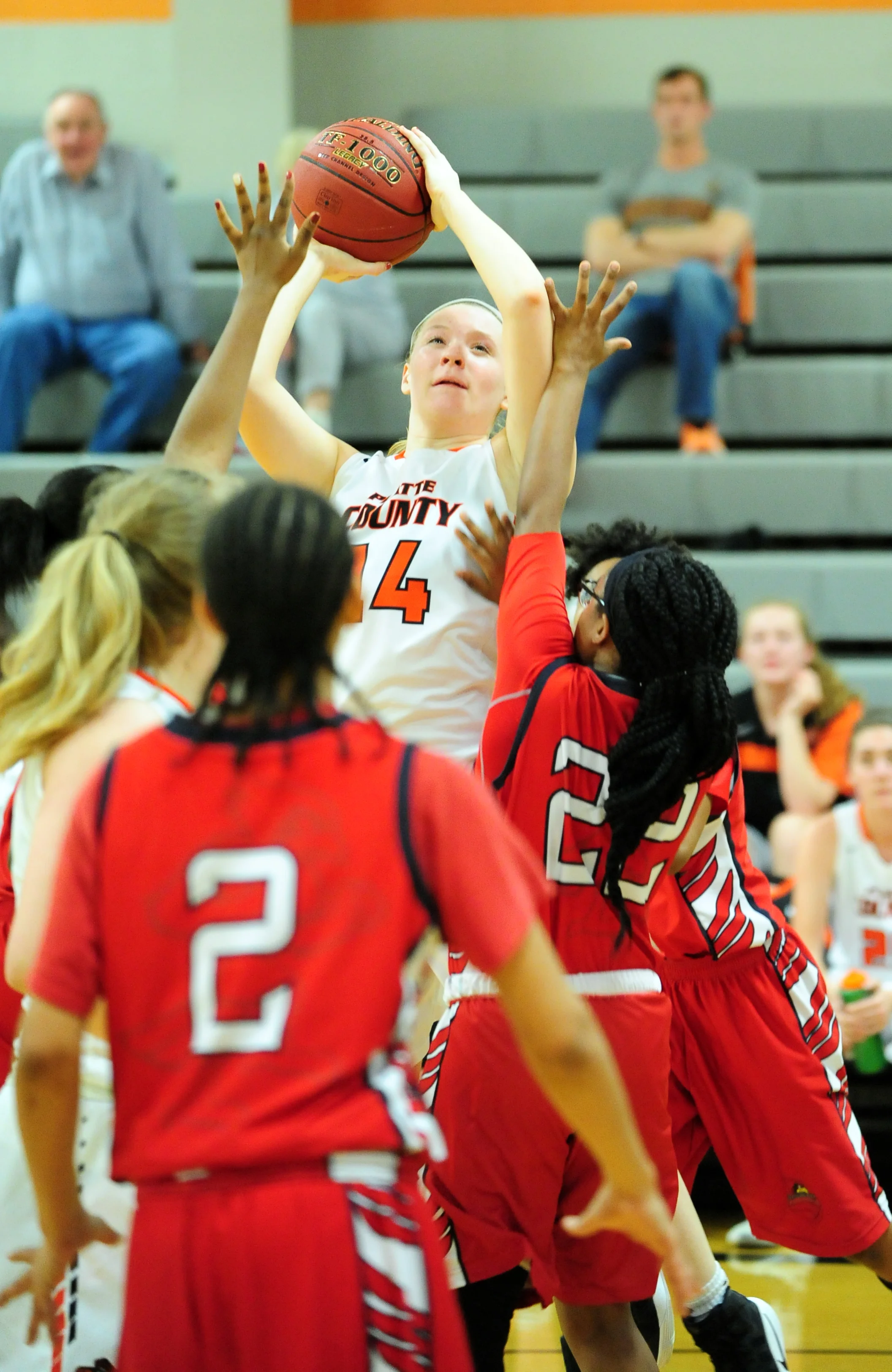 Platte County junior forward Lauren Walker takes a shot over the Raytown defense on Monday, Feb. 20 at Platte County High School.