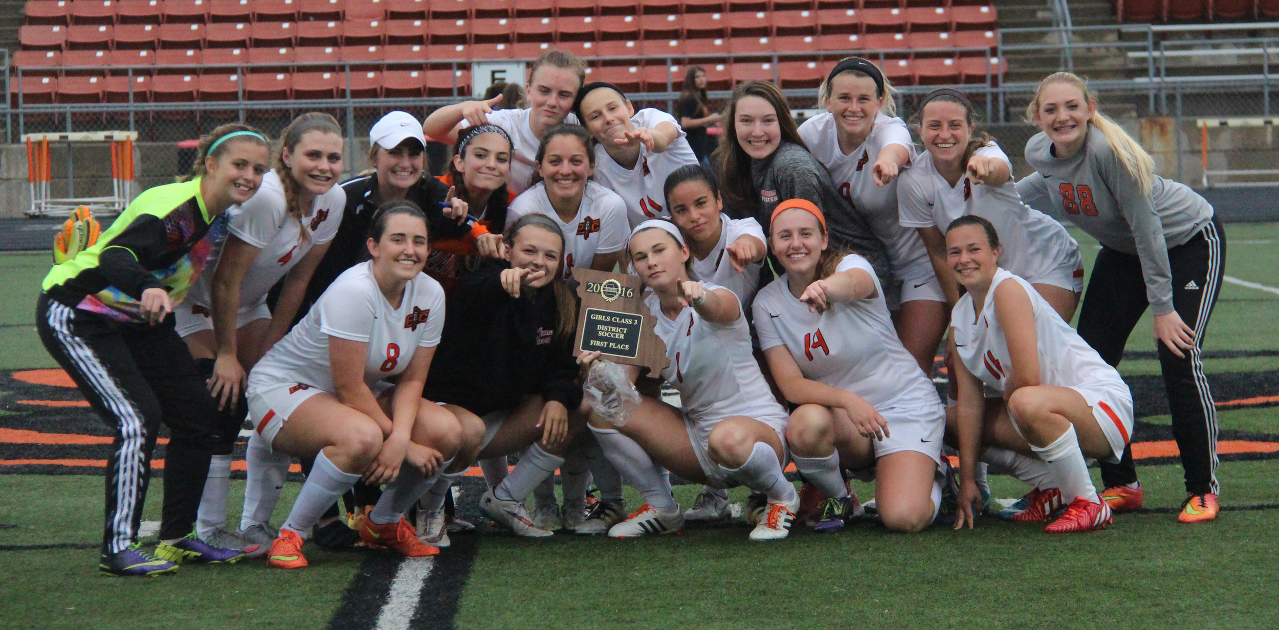 Platte County players celebrate with the Class 3 District 16 championship plaque following a 2-1 overtime win against Smithville on Thursday, May 19 at Pirate Stadium.