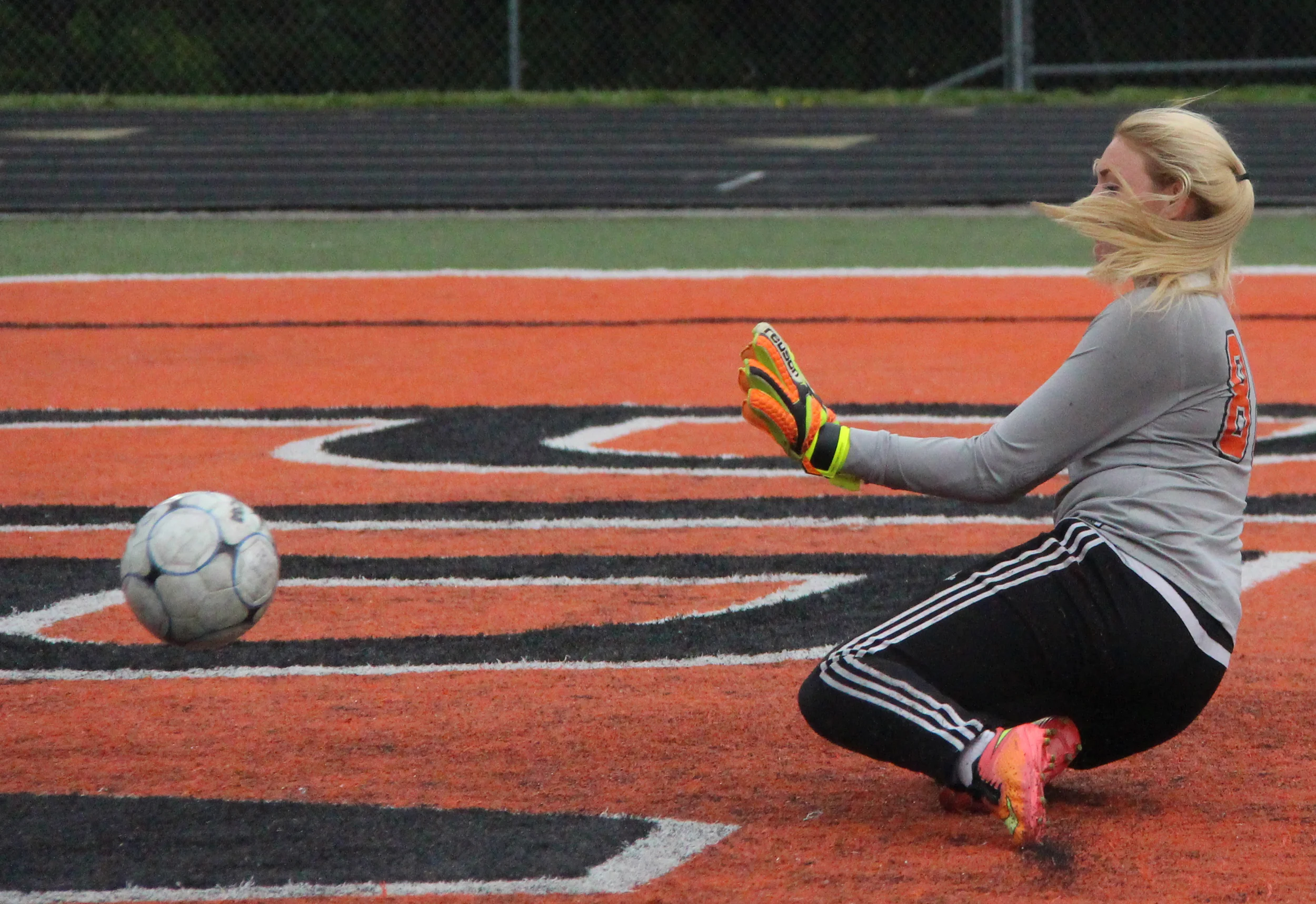 Platte County sophomore goalkeeper Faith Burtchell goes down to try and block a shot Thursday, May 19 against Smithville at Pirate Stadium.