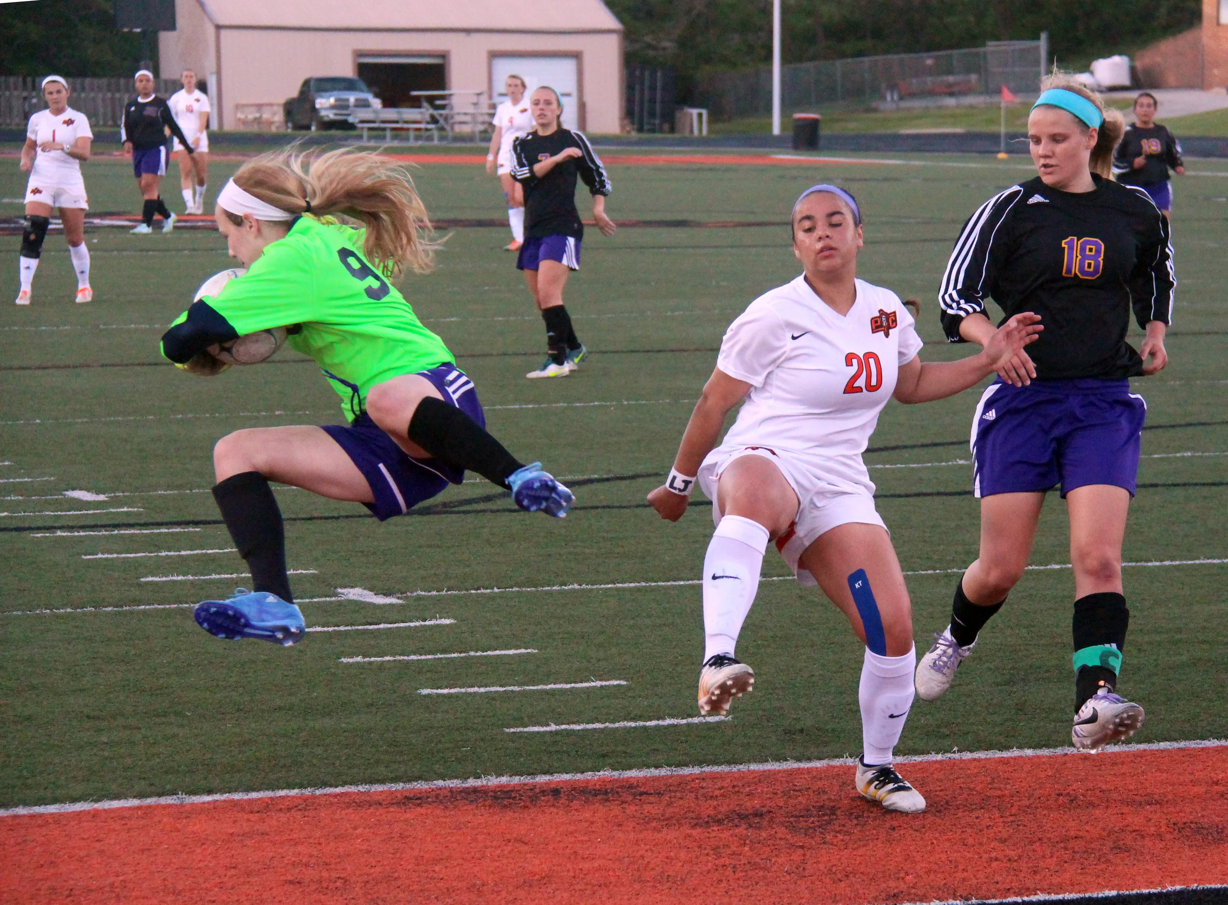 An early turnover led to a goal in the eighth minute, and the chance seemed to start slipping away in the 14th minute on a breakaway. Platte County sophomore goalkeeper Faith Burtchell took down an onrushing Kearney attacker in the box. She avoided a red card, but Ashley Coonfield converted the ensuing penalty kick with Burtchell only able to tip the high shot into the net.