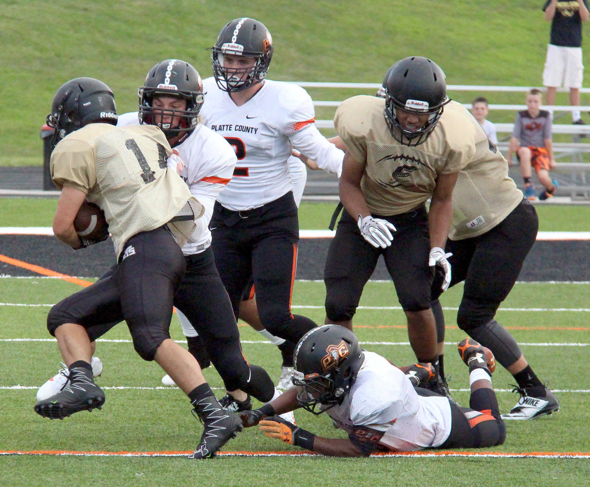 Platte County started on defense against Excelsior Springs and gave up a touchdown on the second play when the Tigers came out in a Wing-T running formation. Excelsior Springs quarterback CJ Rhodes kept around the left end after a fake handoff to create some early excitement.