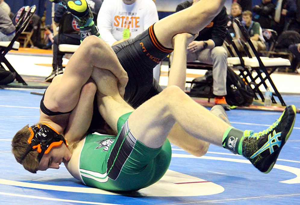 Platte County senior Matthew Schmitt, front, comes through to complete a takedown against Mavrick Alexander of Grain Valley in the Class 3 Missouri State Wrestling Championships’ 132-pound final Saturday, Feb. 20 at Mizzoui Arena in Columbia, Mo.