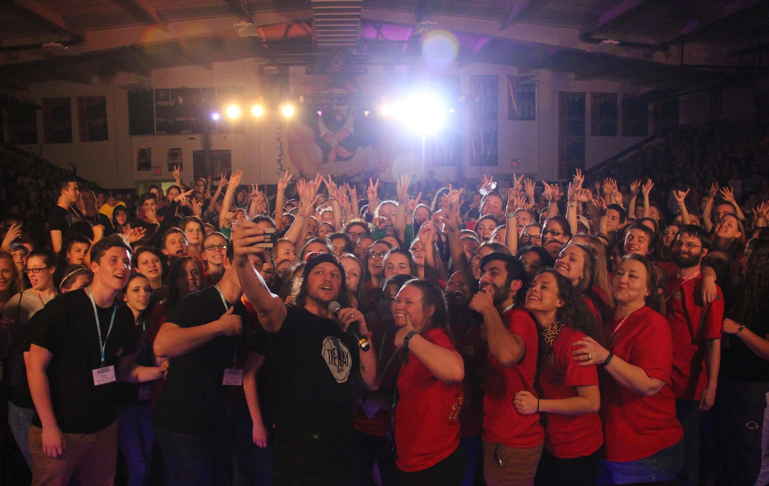 Motivational speaker Mike Smith, center, took a moment for a mass group selfie after he delivered the keynote speech during the opening ceremony of the Missouri Association of Student Councils annual convention held in March at Platte County High School.