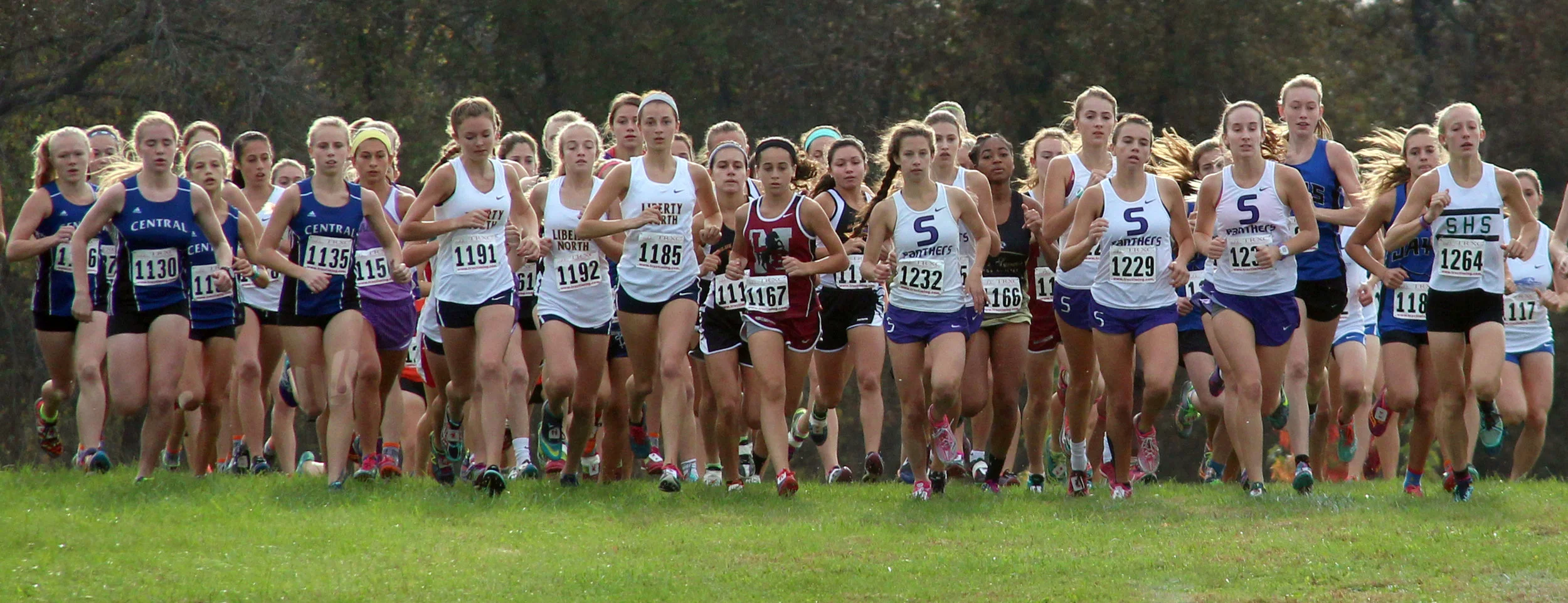 Park Hill South senior Lexi Maddox (1732), senior Jasmine Crawford (1229) and junior Marti Heit (123) lead the pack at the start of the Class 4 Sectional 4 race Saturday, Oct. 29 at Jesse James Park in Kearney, Mo.
