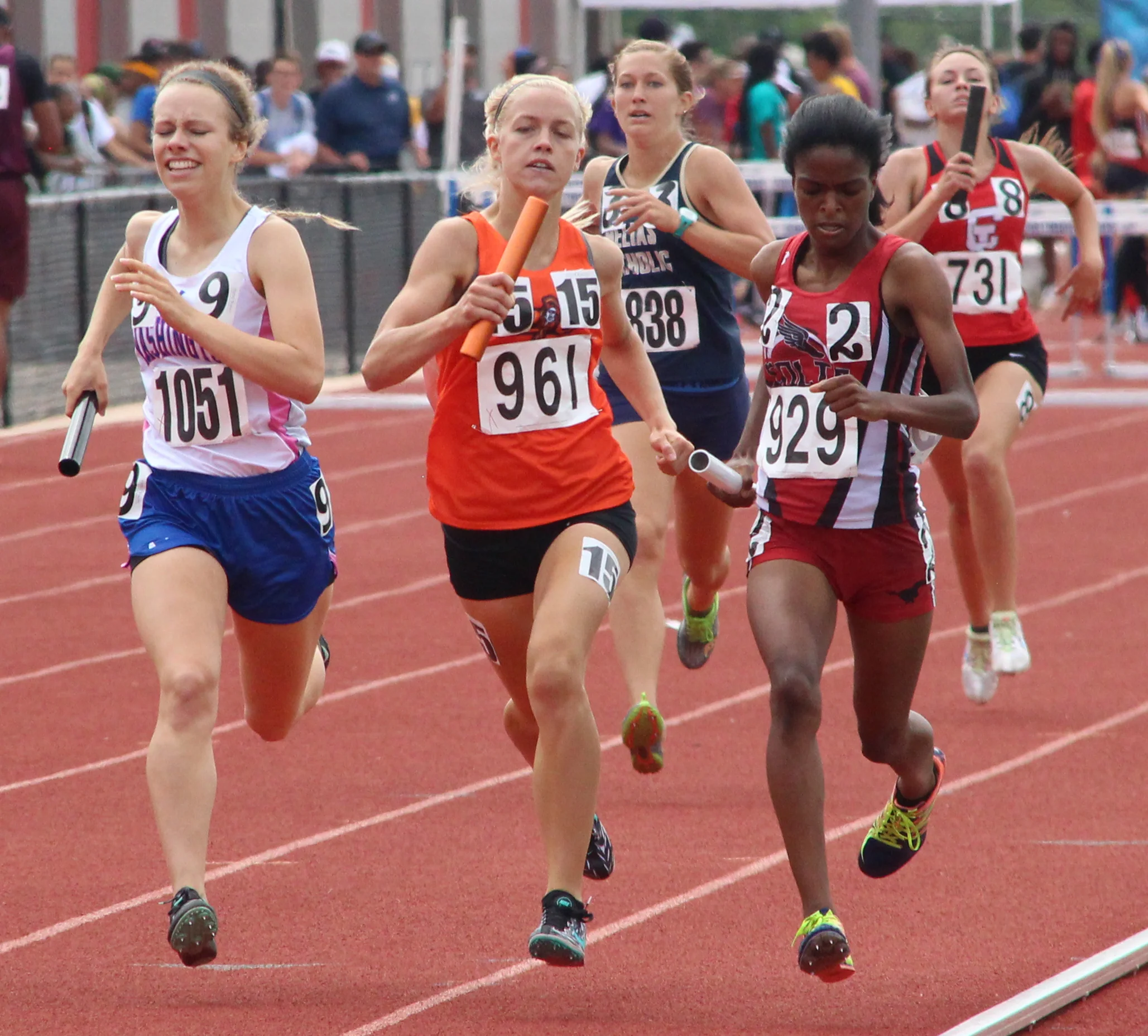 Platte County junior Rebekah Geddes (961) leads a pack of runners on the final lap of the 4x800-meter relay Friday, May 26 at Adkins Stadium in Jefferson City, Mo.