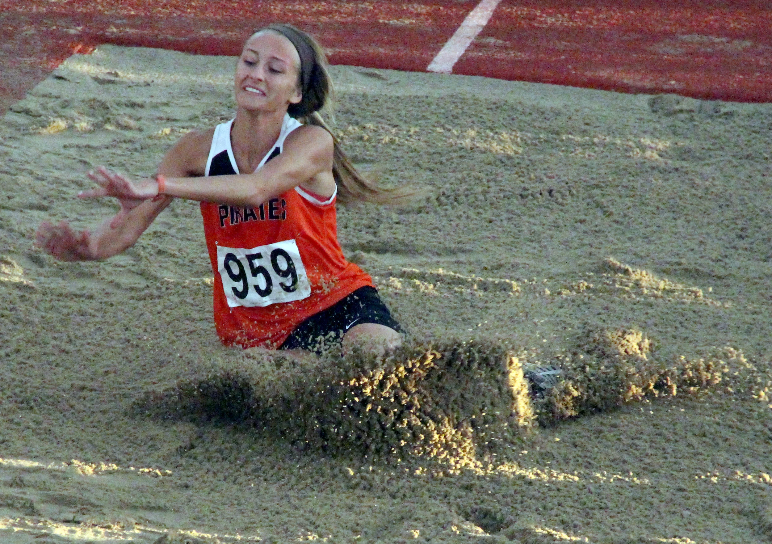 Platte County senior Tori Farr hits the sand in Saturday evening’s long jump competition.