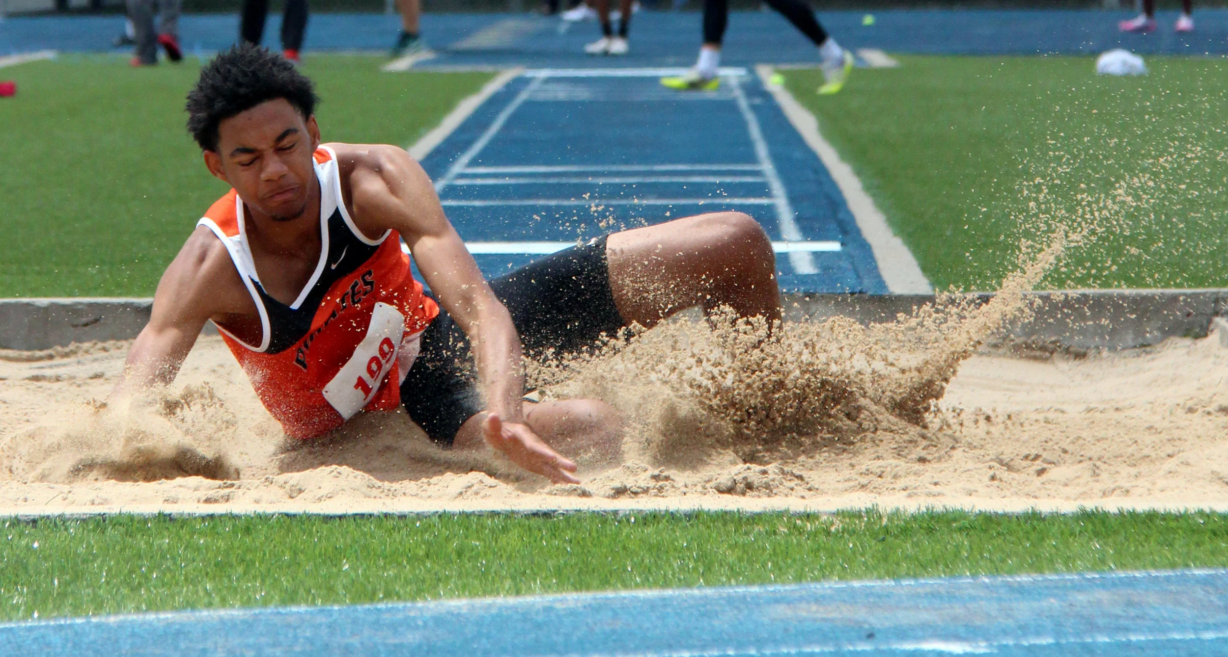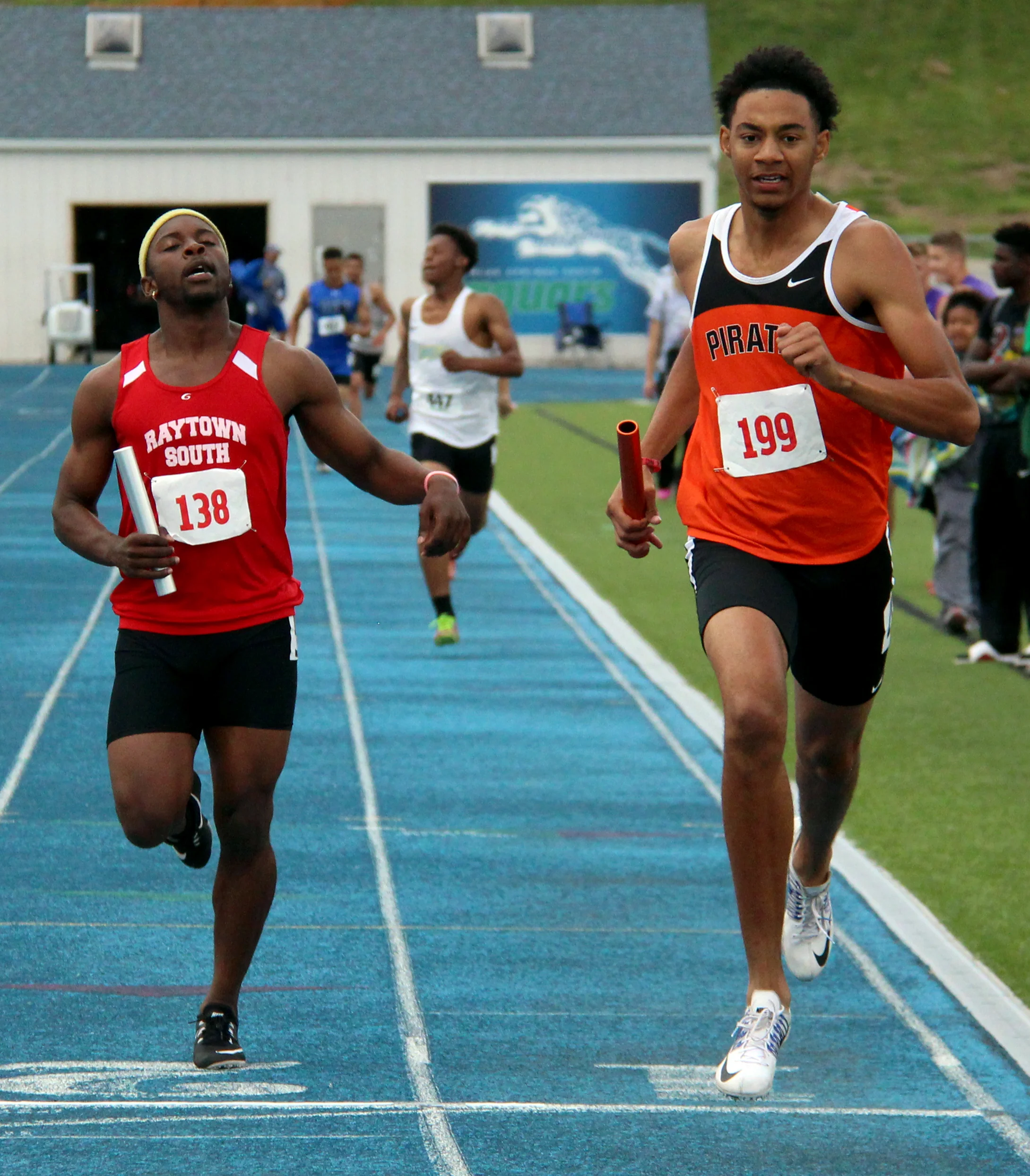 Platte County’s lanky junior anchor leg of the 4x400-meter relay charged to the finish line in the final race of the Class 4 Sectional 4 meet Saturday, May 20 at Blue Springs South High School to win the event for the Pirates in a season-best of 3 minutes, 24.89 second — about 3 seconds better than the previous best time. Raytown South came in second about a half second behind.