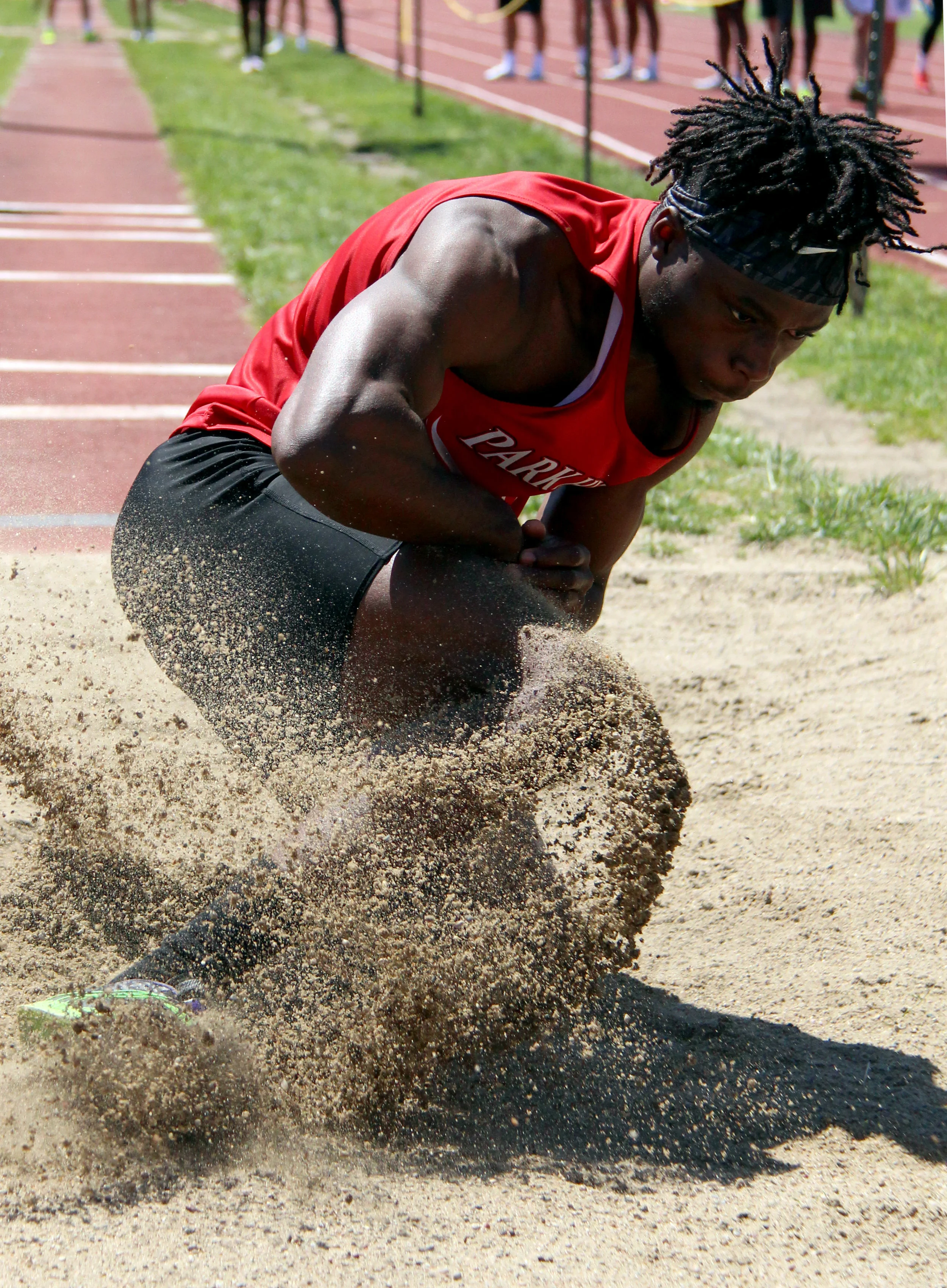 Park Hill senior Papay Glaywulu hits the sand on a triple jump attempt during the Class 5 District 8 meet Saturday, May 13 at Park Hill District Stadium in Kansas City, Mo.