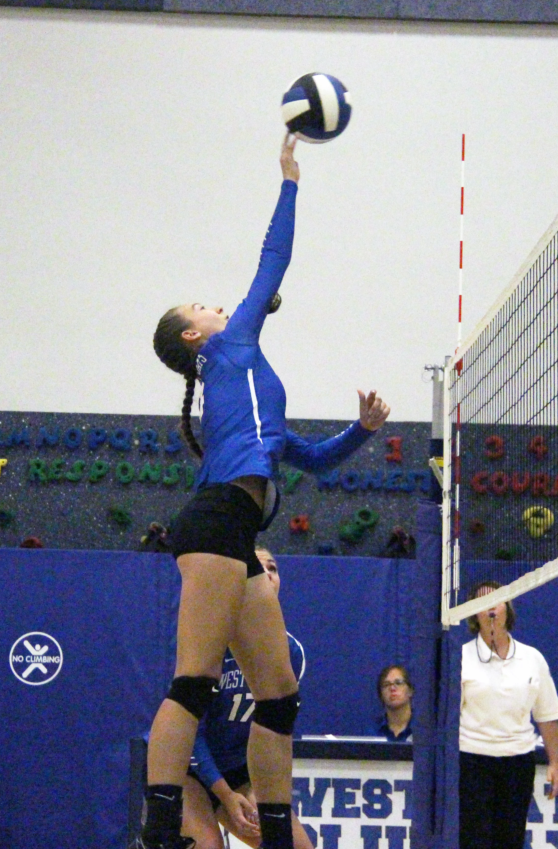 West Platte senior Jordan Schultz tips a ball over the net during a September match with East Buchanan at West Platte Elementary School in Weston, Mo. Schultz received multiple postseason honors.